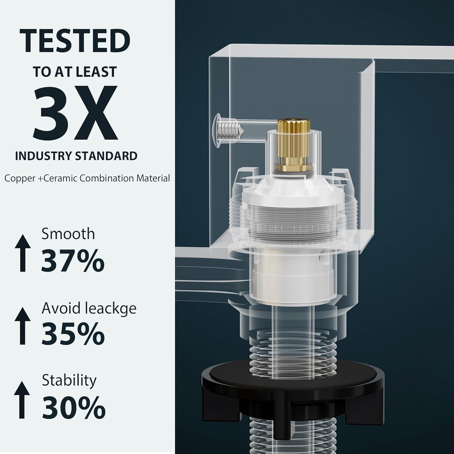 REINFORCED CORE: Forious 3 hole bathroom faucet drip-free copper&ceramic disc mixing cartridge has passed 500,000 cycles of water tightness test, to ensure high air tightness and stable, which is unaffected by temperature extremes, sand, rust, and hard water conditions