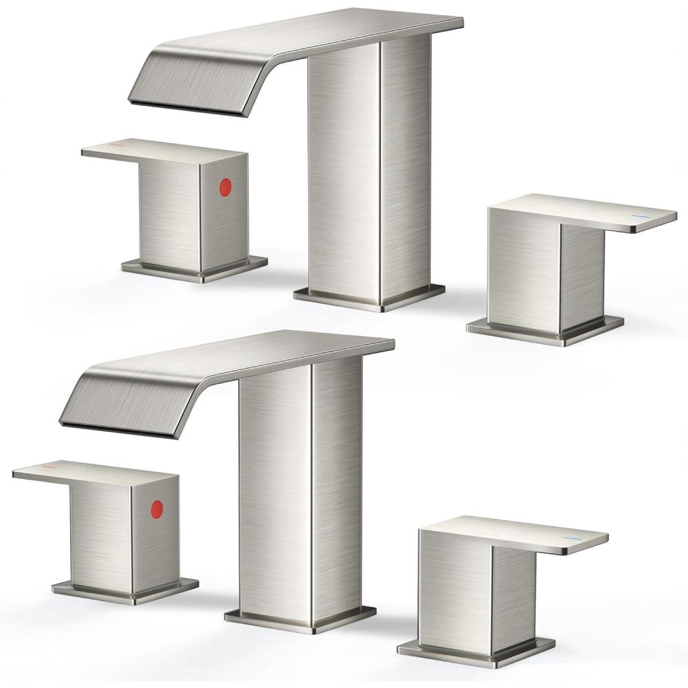 imageFORIOUS 2 Pack Square Brushed Gold Bathroom Faucets 3 Hole Waterfall 8 Inch Widespread Bathroom Sink Faucet with Metal Popup Drain and Supply Lines Two Handles for Vanity Lavatory RestroomBlack and Brushed Nickel