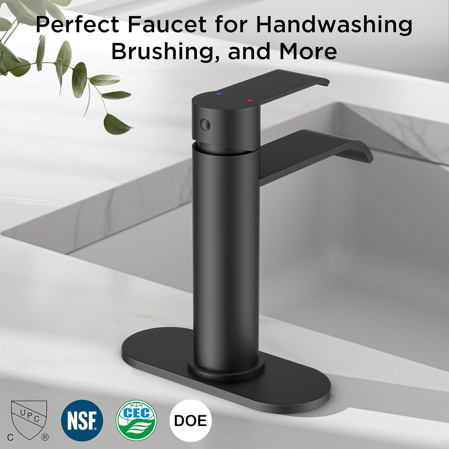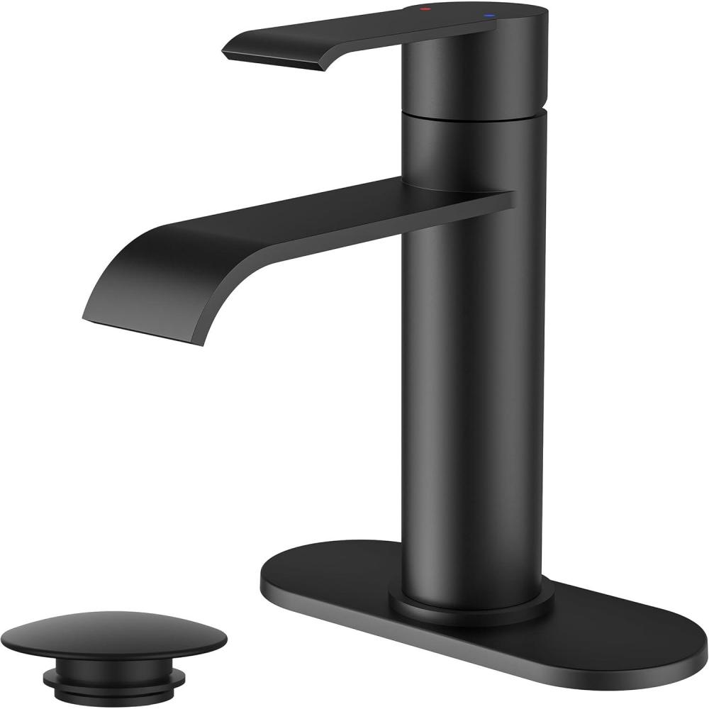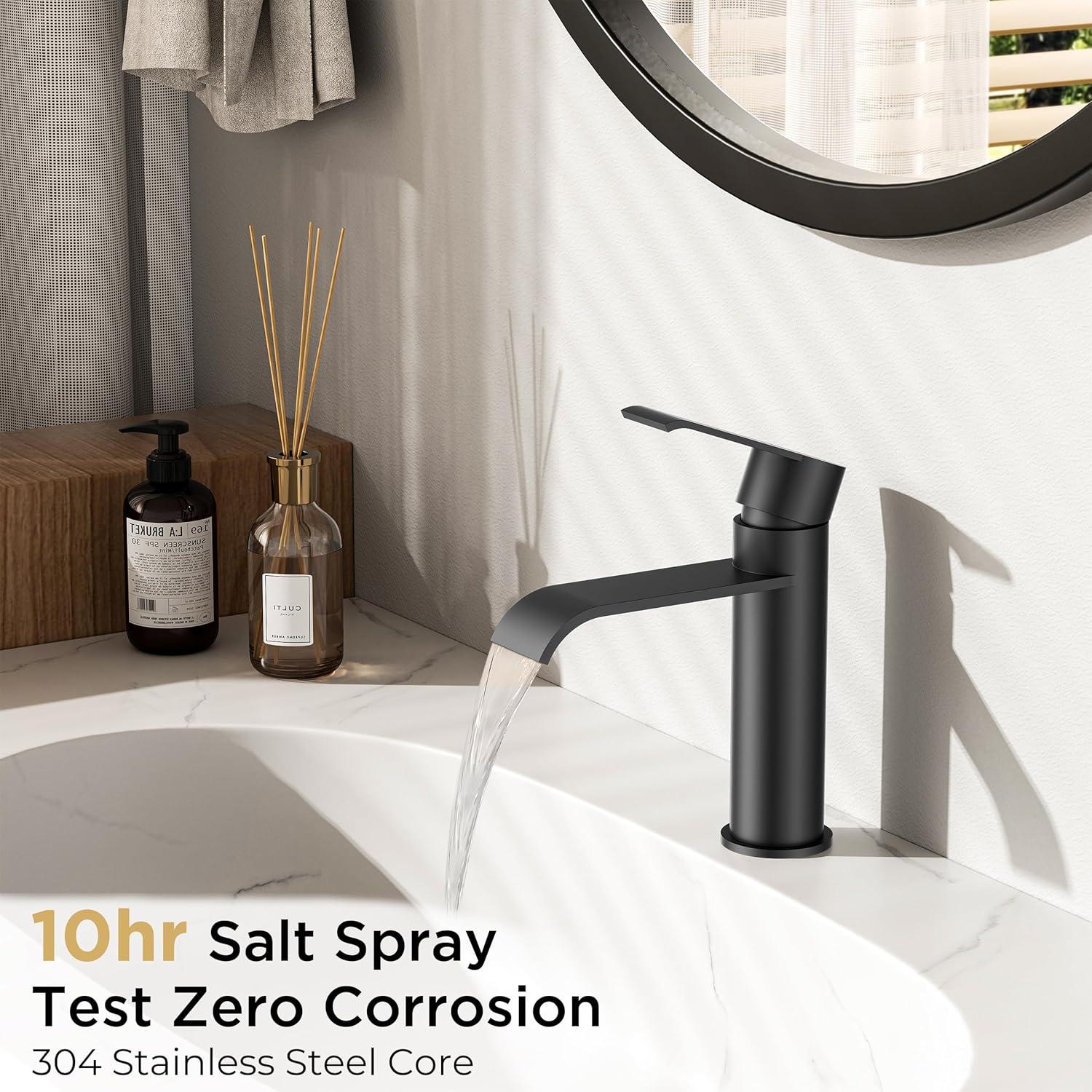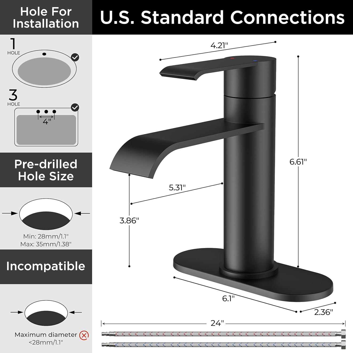 FORIOUS Brushed Nickel Bathroom Faucets, Modern Waterfall Bathroom for 1 or 3 Hole, Single Handle Faucets with Metal Pop Up Drain and 24″ Supply Hoses(Matte Black)