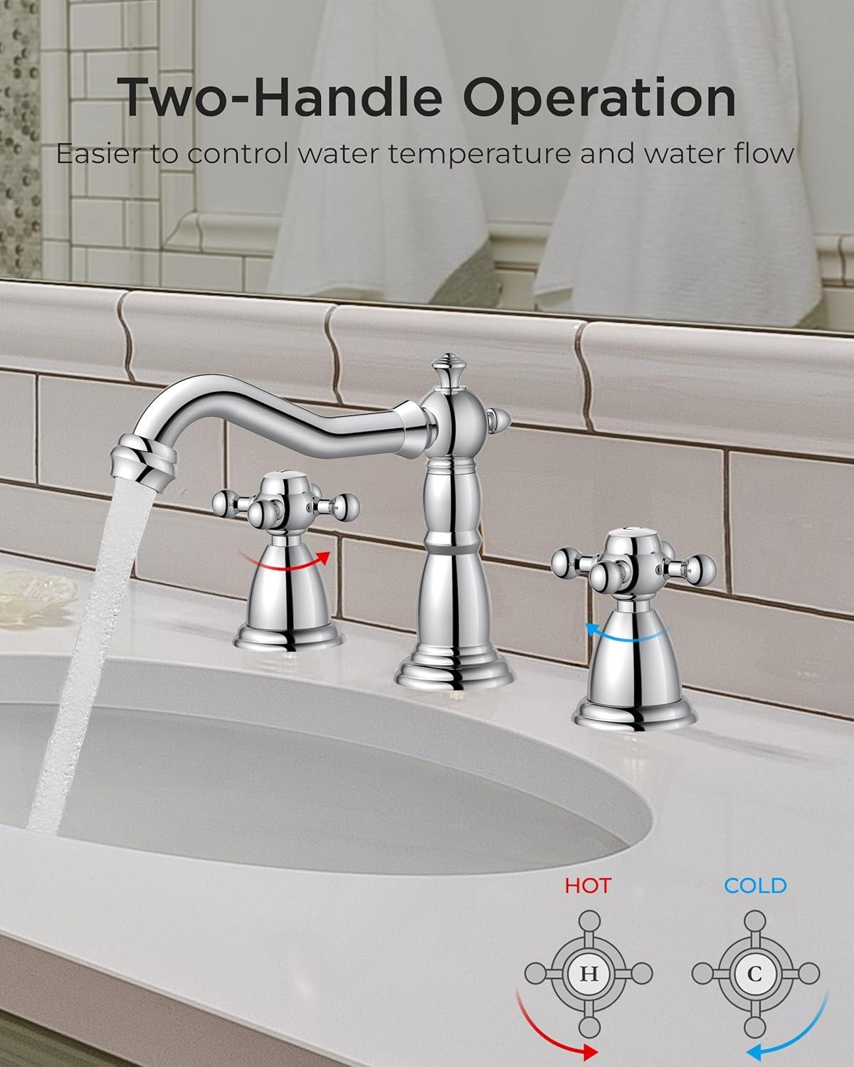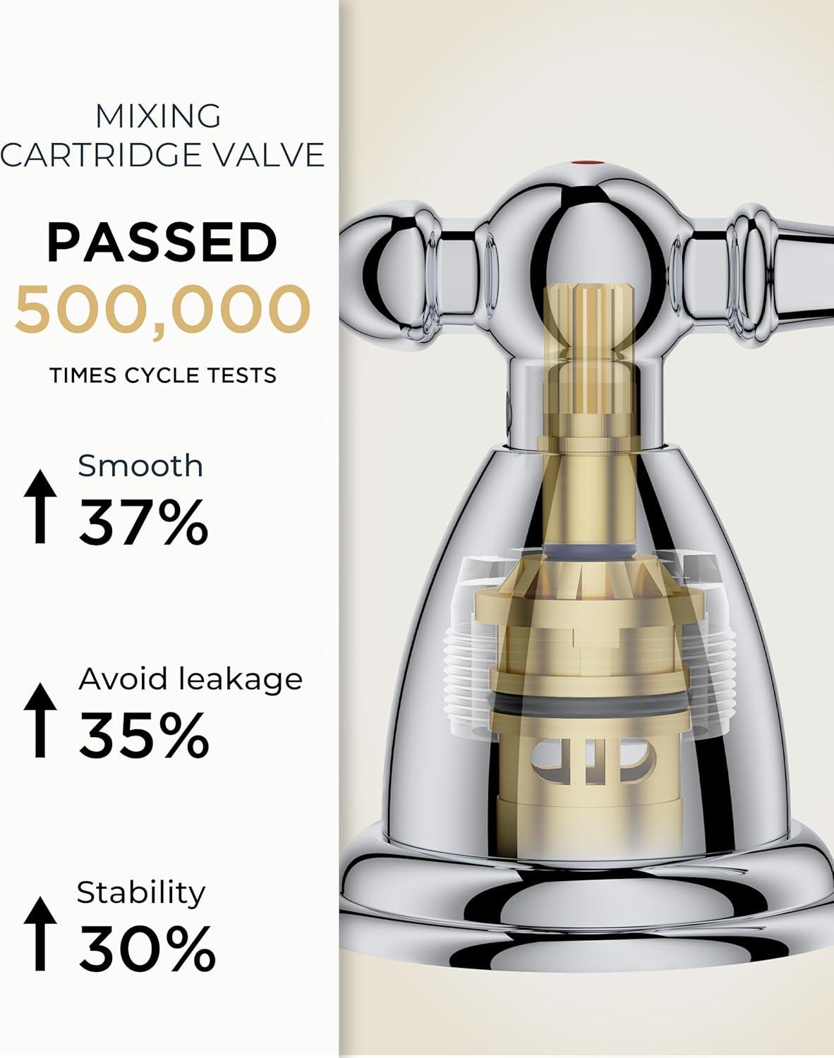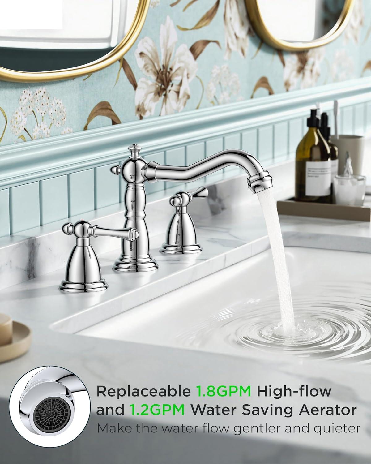 Maximum Efficiency: Two-handle vanity faucets 3 hole makes adjusting water flow and temperature easy. The built-in bubbling flow rate: 1.2gpm/4.5L/min at Max 60psi aerator saves 30% water and reduces splashing. It passed NSF372,CUPC lead-free and DOE water saving certifications