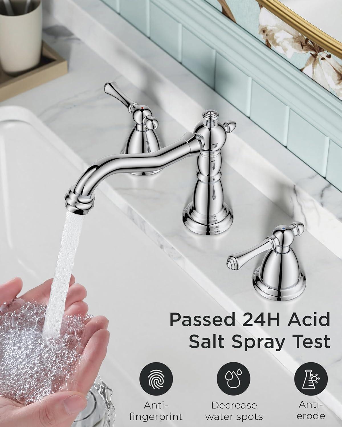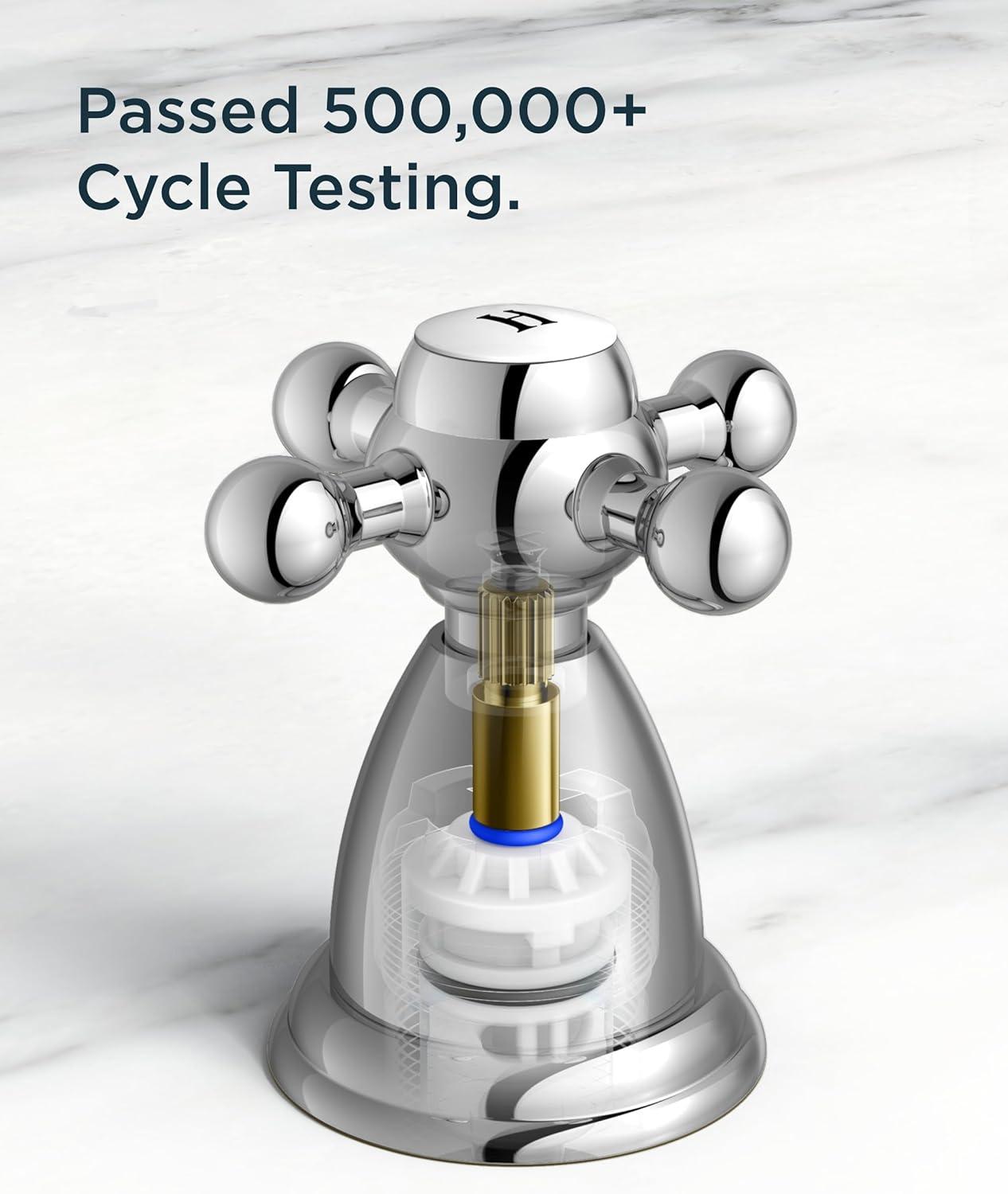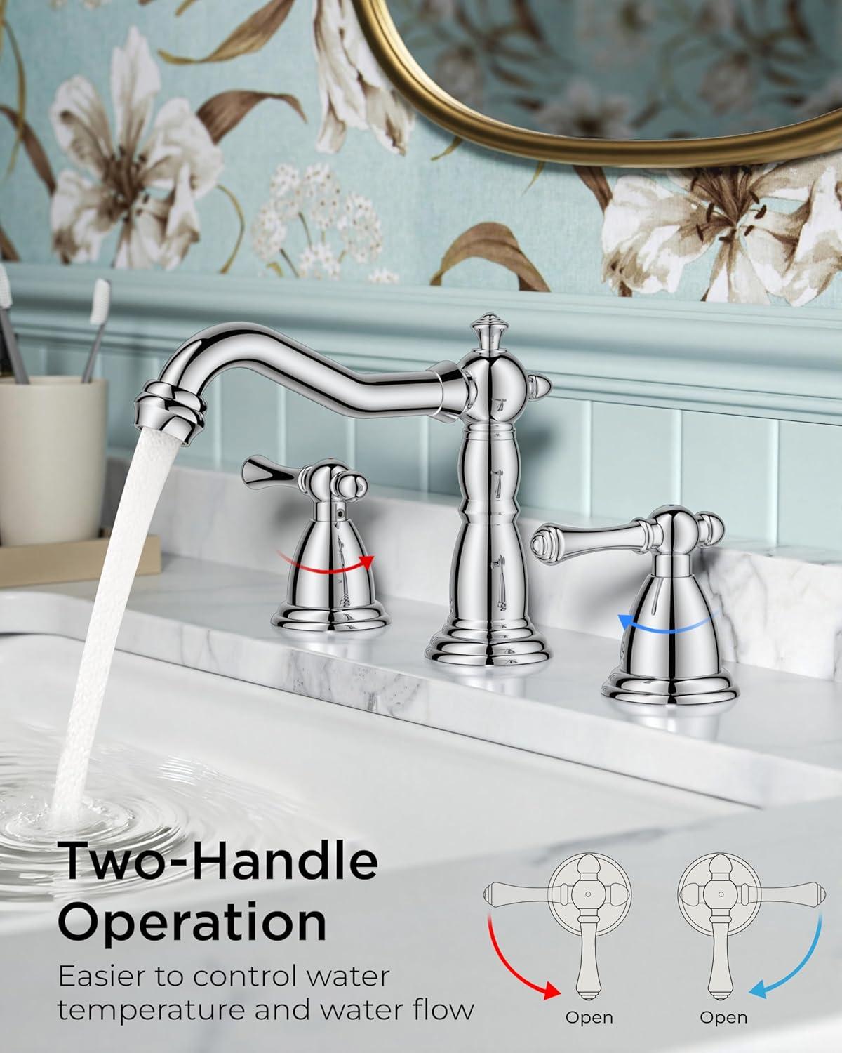 Maximum Efficiency: Two-handle vanity faucets 3 hole makes adjusting water flow and temperature easy. The built-in bubbling flow rate: 1.2gpm/4.5L/min at Max 60psi aerator saves 30% water and reduces splashing. It passed NSF372,CUPC lead-free and DOE water saving certifications