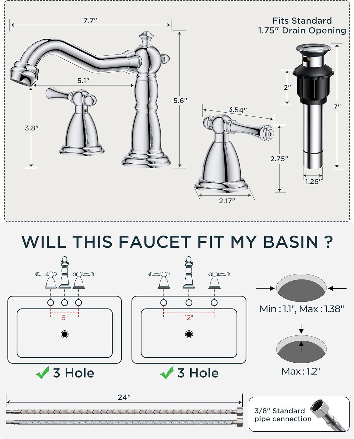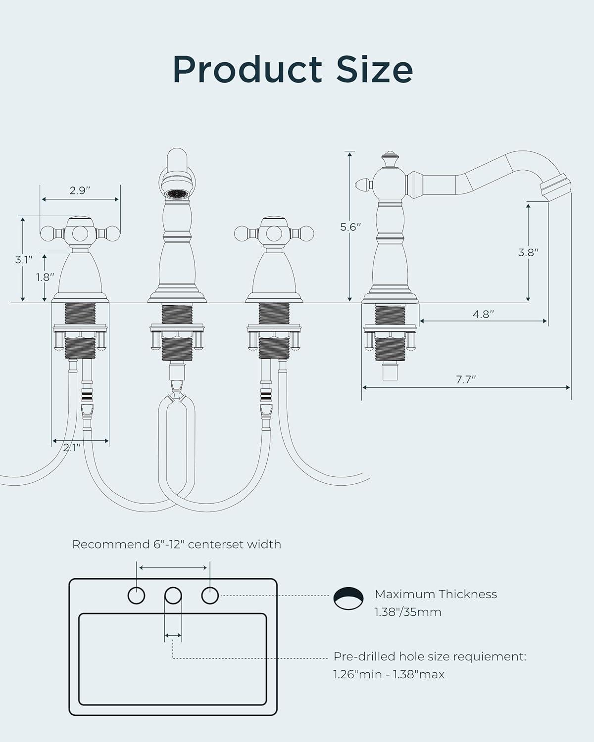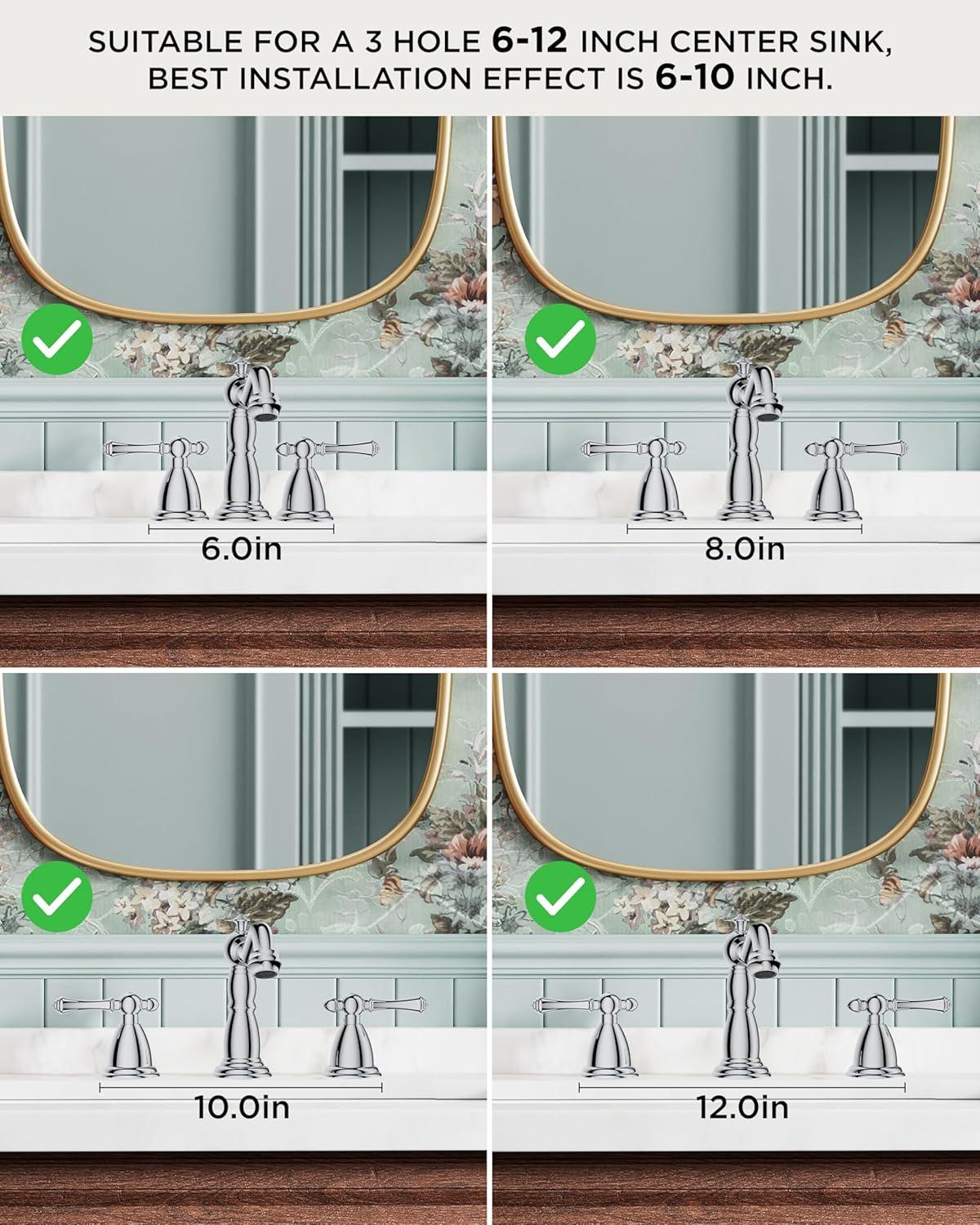 3-Hole Widespread Sink Faucet: The 8 inch widespread bathroom faucet is suitable for a 3-hole widespread vanity lavorty farmhouse bathroom sink. The recommended hole distance is 6-12inches, hole diameter is 1.1″ min and 1.38″ max, the thickess of bathsin hole is 1.2″. The faucet hieght is 5.6″, please make sure the distance between the mirro or cabinet is higher than 5.8″
