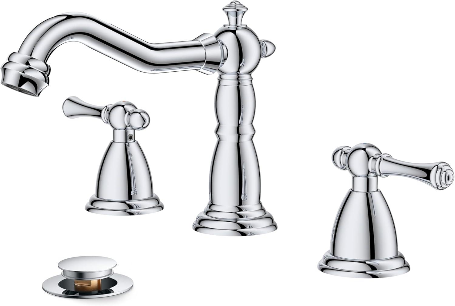 imageFORIOUS Brushed Nickel Bathroom Sink Faucet 3 Holes 2 Handle Widepsread Antique Faucet for Bathroom Sink with PopUp Drain and Water Supplies for Commercial Vanity Lavatory Restroom FarmhouseChrome