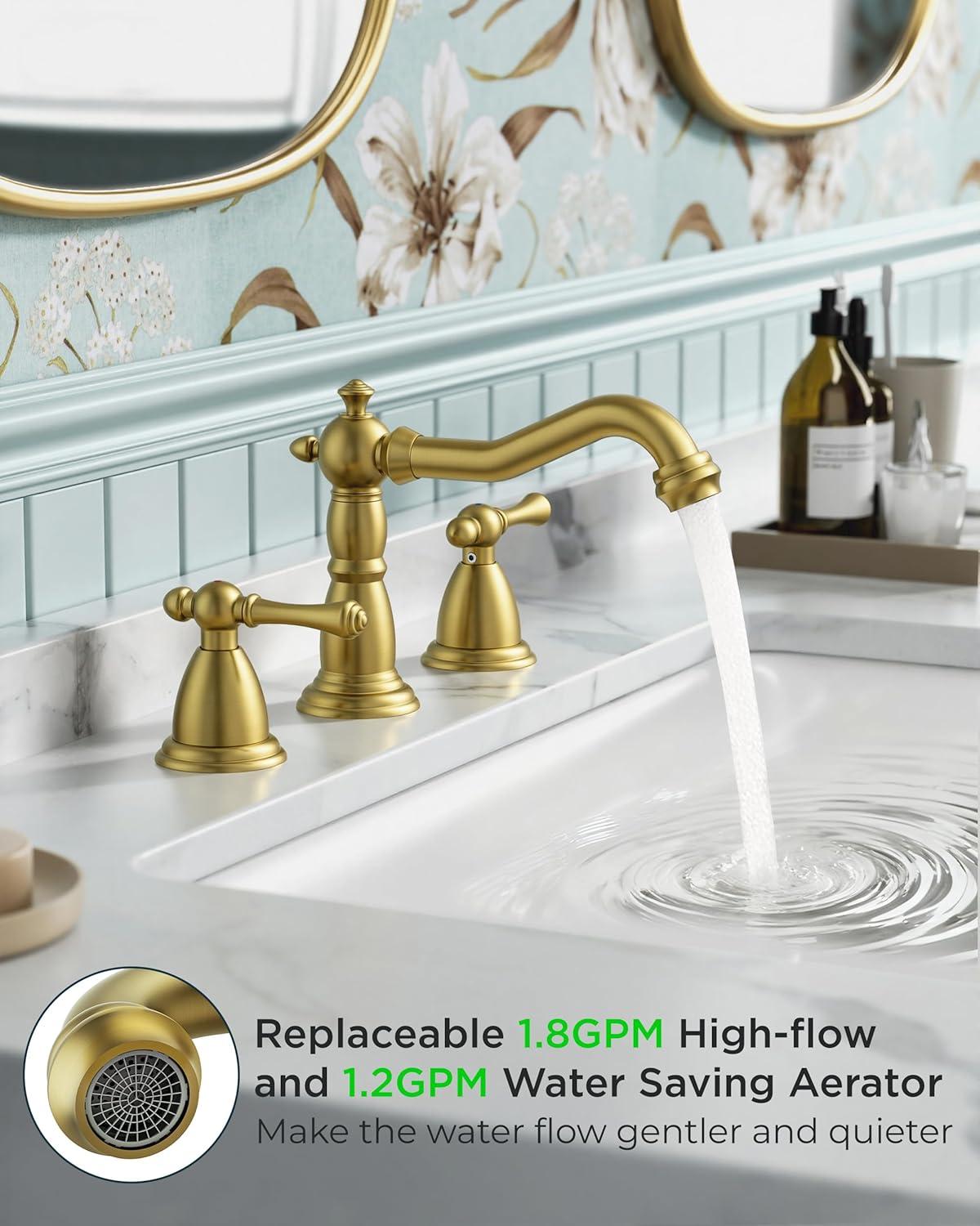 Maximum Efficiency: Two-handle vanity faucets 3 hole makes adjusting water flow and temperature easy. The built-in bubbling flow rate: 1.2gpm/4.5L/min at Max 60psi aerator saves 30% water and reduces splashing. It passed NSF372,CUPC lead-free and DOE water saving certifications