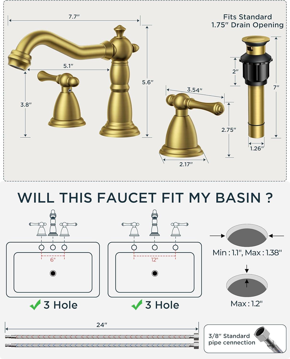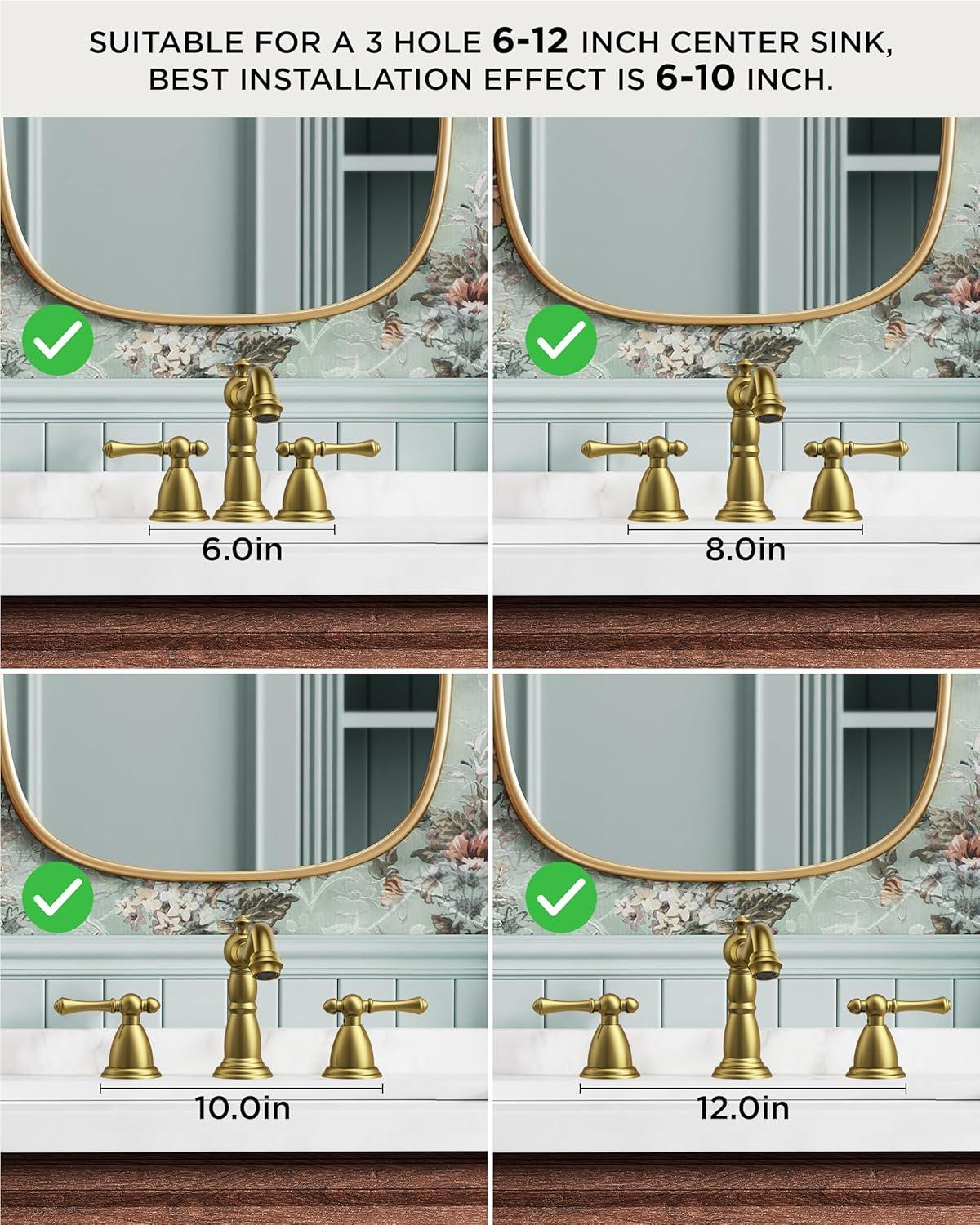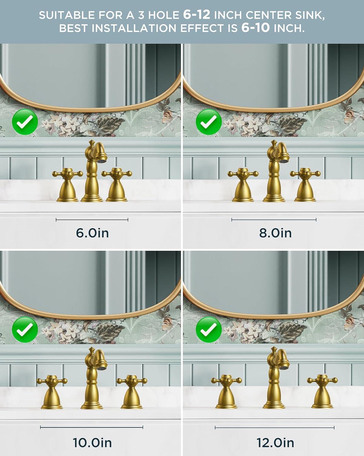 3-Hole Widespread Sink Faucet: The 8 inch widespread bathroom faucet is suitable for a 3-hole widespread vanity lavorty farmhouse bathroom sink. The recommended hole distance is 6-12inches, hole diameter is 1.1″ min and 1.38″ max, the thickess of bathsin hole is 1.2″. The faucet hieght is 5.6″, please make sure the distance between the mirro or cabinet is higher than 5.8″