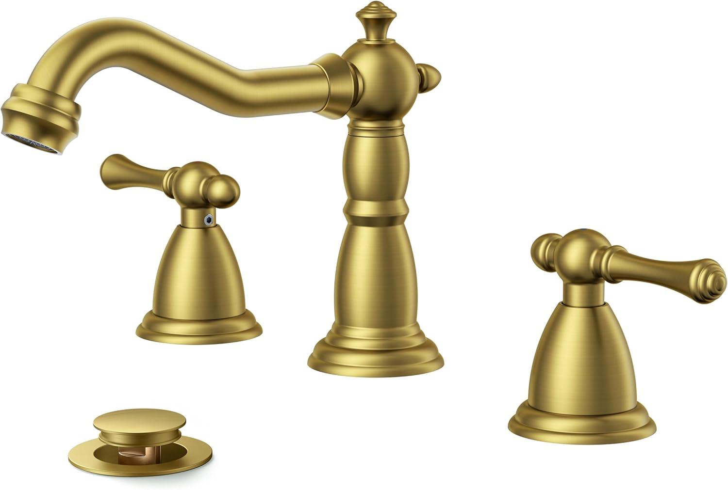 imageFORIOUS Brushed Nickel Bathroom Sink Faucet 3 Holes 2 Handle Widepsread Antique Faucet for Bathroom Sink with PopUp Drain and Water Supplies for Commercial Vanity Lavatory Restroom FarmhouseGold