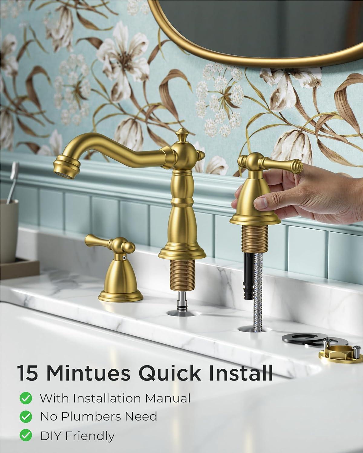 FORIOUS Brushed Nickel Bathroom Sink Faucet 3 Holes, 2 Handle Widepsread Antique Faucet for Bathroom Sink with Pop-Up Drain and Water Supplies for Commercial Vanity Lavatory Restroom Farmhouse(Gold)