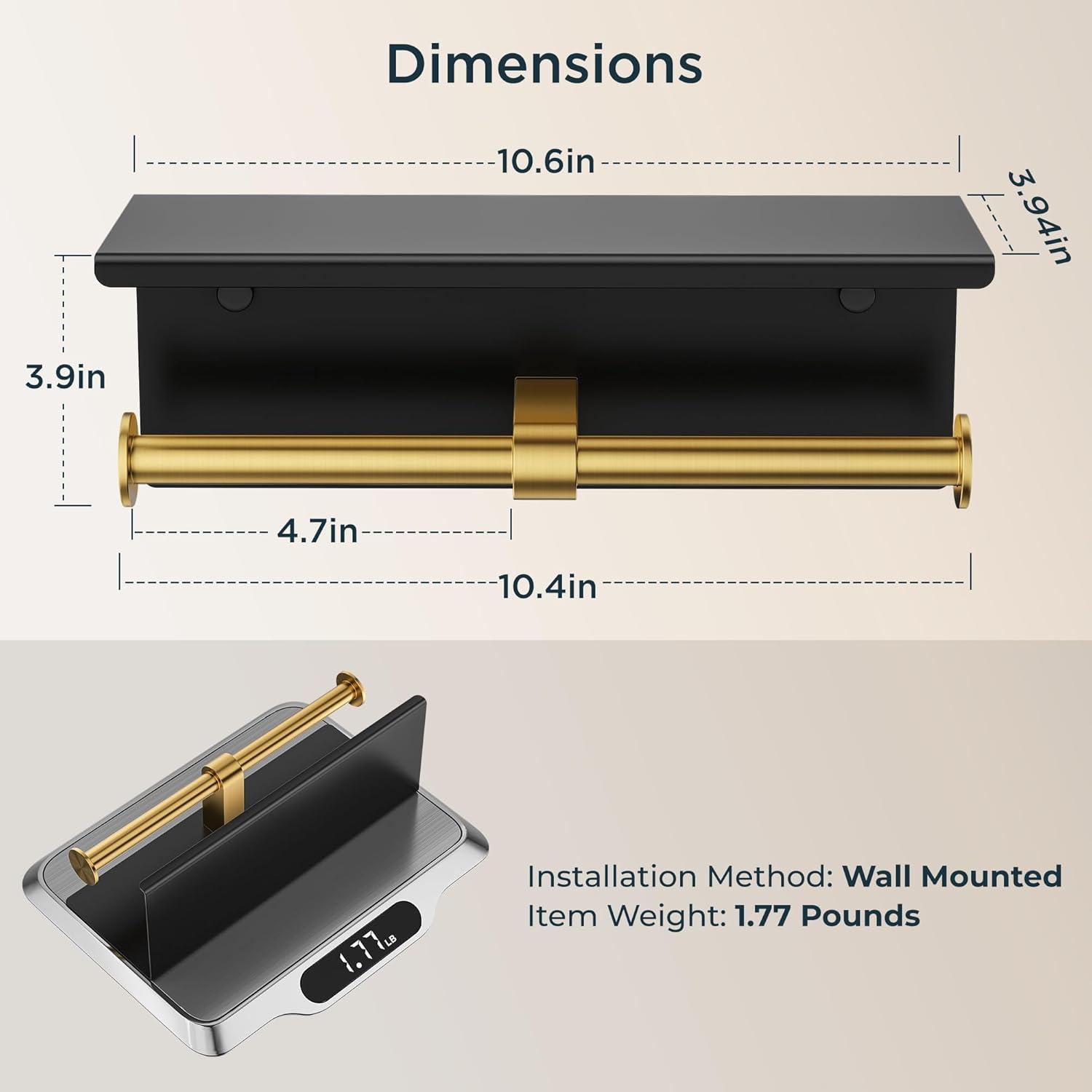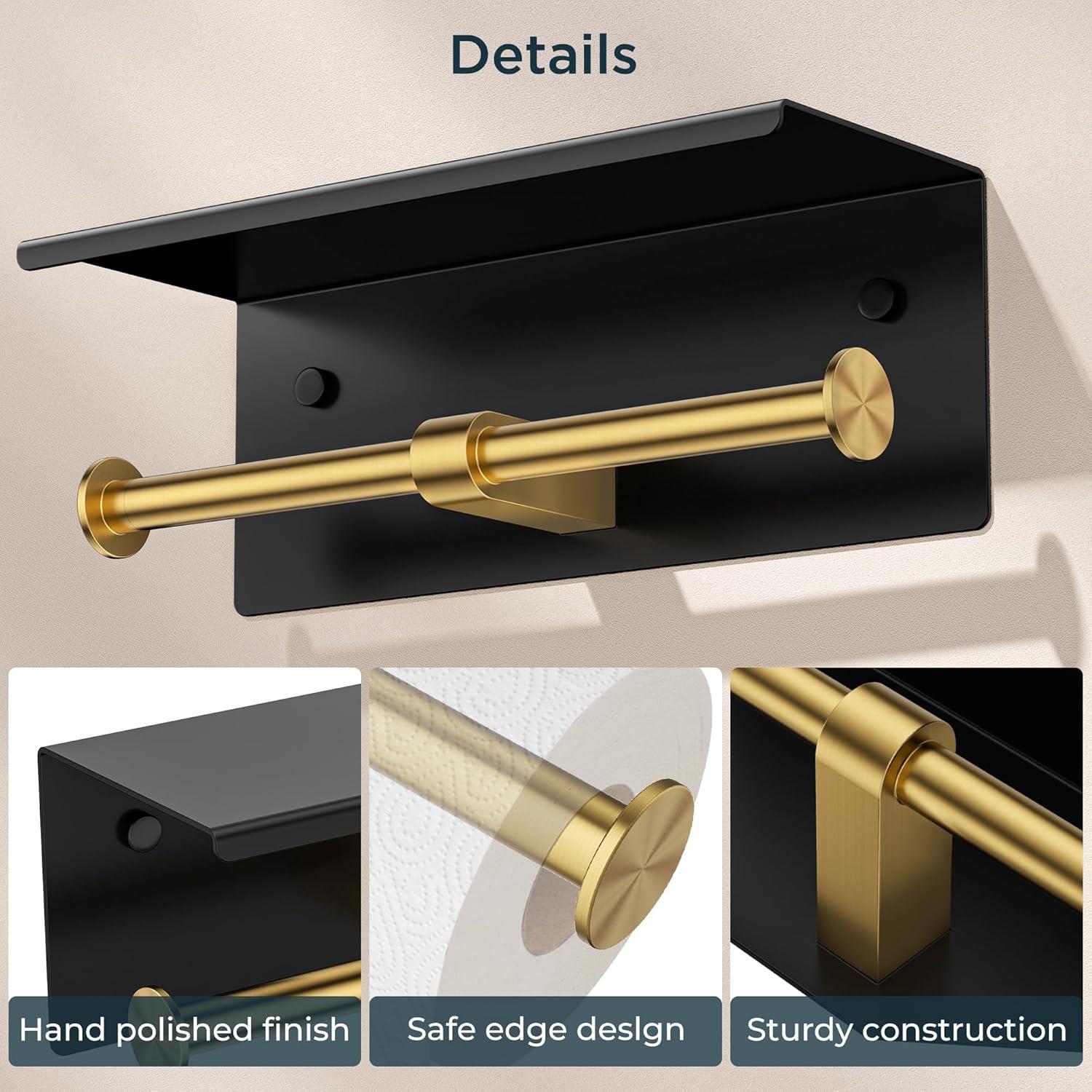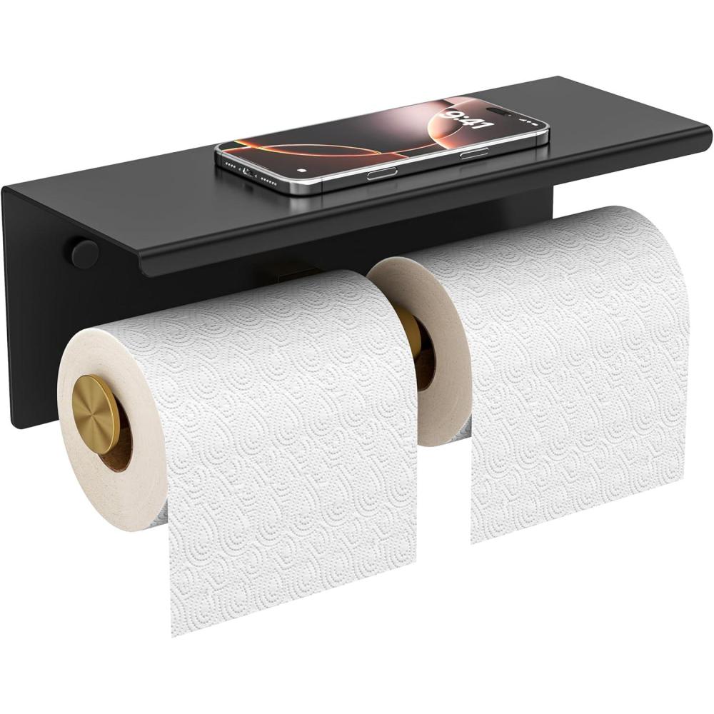 FORIOUS Double Toilet Paper Holder with Shelf, Wall Mount Tissue Roll Holder for Bathroom, 304 Stainless Steel Commercial Toilet Tissue Dispensers with Phone Shelf (1, Stainless Steel)(Matte Black & Brushed Gold)