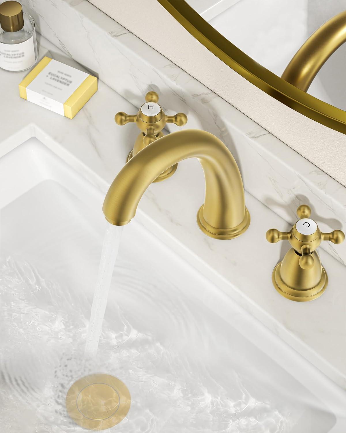FORIOUS Faucet for Bathroom Sink 3 Hole, Brushed Nickel Bathroom Faucet Widespread with Pop Up Drain and Water Hose Supply, 2 Cross Handle Design, for Vanity RV Farmhouse Sink(Brushed Gold)