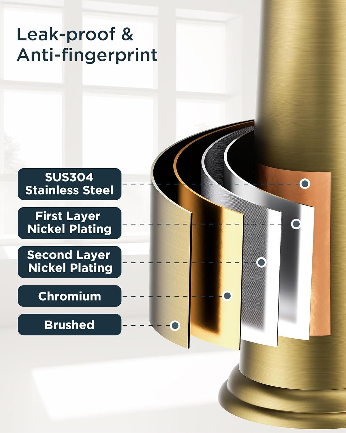 imageFORIOUS Faucet for Bathroom Sink 3 Hole Brushed Nickel Bathroom Faucet Widespread with Pop Up Drain and Water Hose Supply 2 Cross Handle Design for Vanity RV Farmhouse SinkBrushed Gold