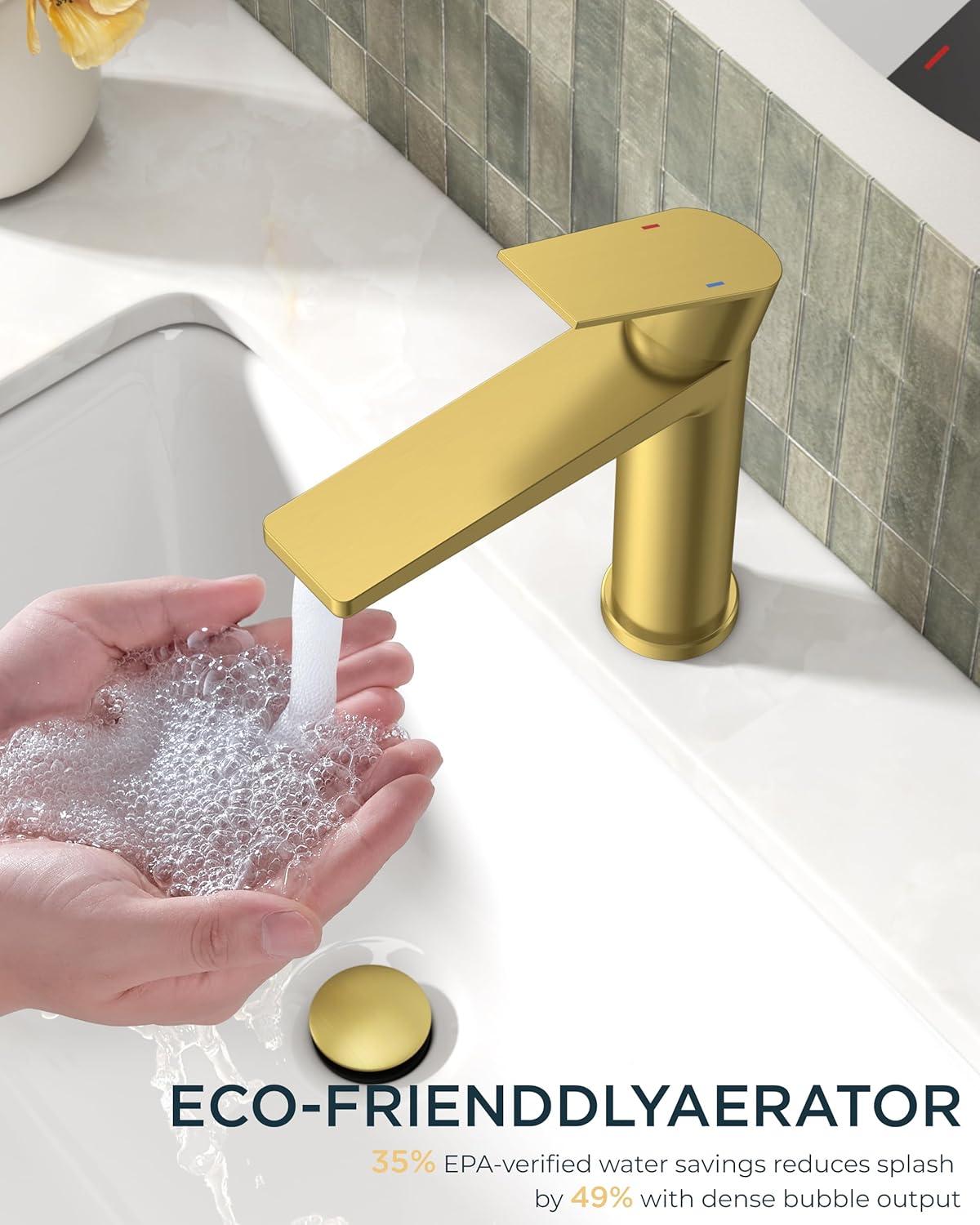 FLEXIBLE DUAL AERATOR SYSTEM: The gold single hole bathroom faucet pre-installed high-pressure aerator + included spare 1.2gpm WaterSense spare aerator (30% water savings). Interchangeable design adapts to high/low water pressure needs