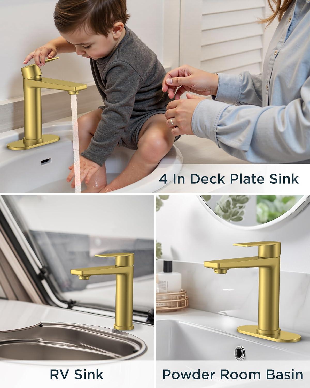 IDEAL FOR DIVERSE COMPACT SPACES: Modern single-lever design for effortless flow/temperature control. The gold faucet for bathroom sink Perfect for bathroom sinks, powder rooms, RVs, campers, travel trailers, laundry rooms, and restroom sinks