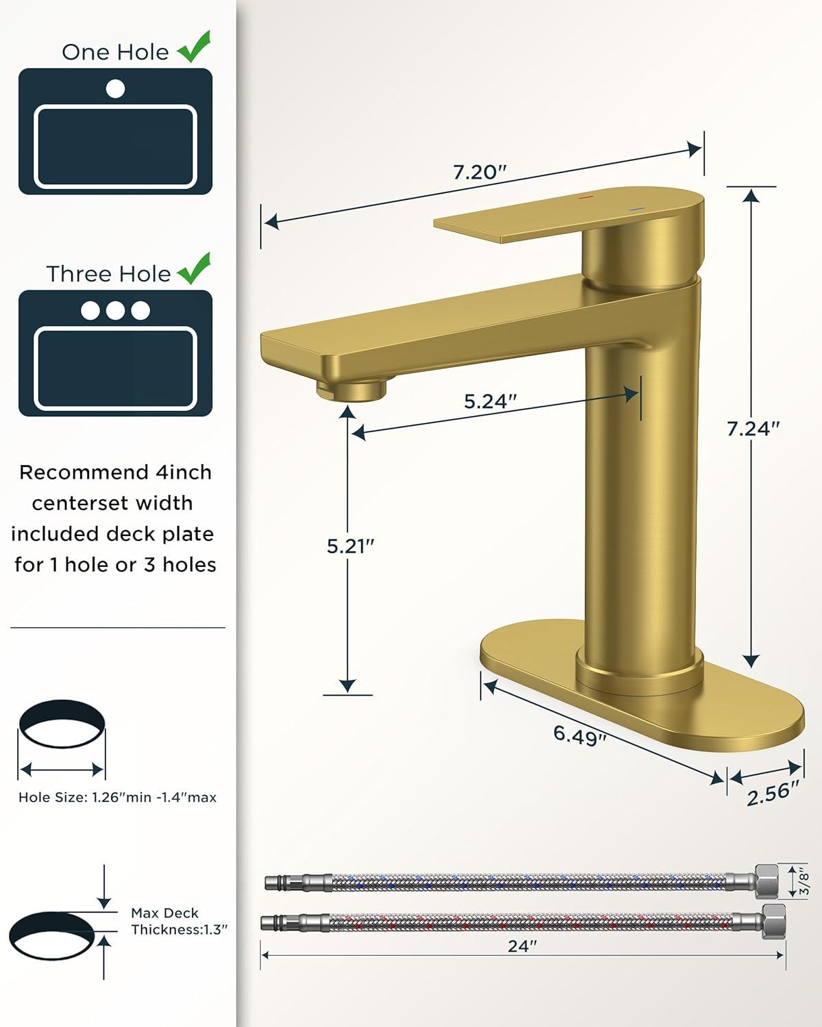 10-Min DIY: Single-hole mount creates a cleaner look on custom countertops. Optional 6.49″×2.56″ deck plate for 3-hole, 4″ center basin installations. Survey shows 96% of users install gold vanity faucet without a plumber. Everything included