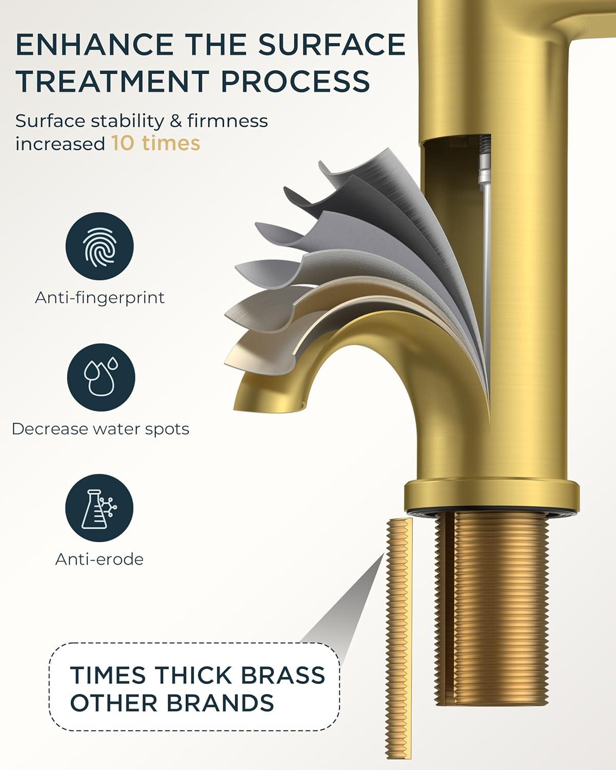 CERTIFIED DURABILITY & SAFETY: The gole bathroom faucet complies with NSF, CUPC, DOE, CEC certification standards to ensure clean and safe water. High-sealing commercial ceramic disc cartridge tested to 500,000 cycles ensures brushed gold bathroom faucet drip-free durability