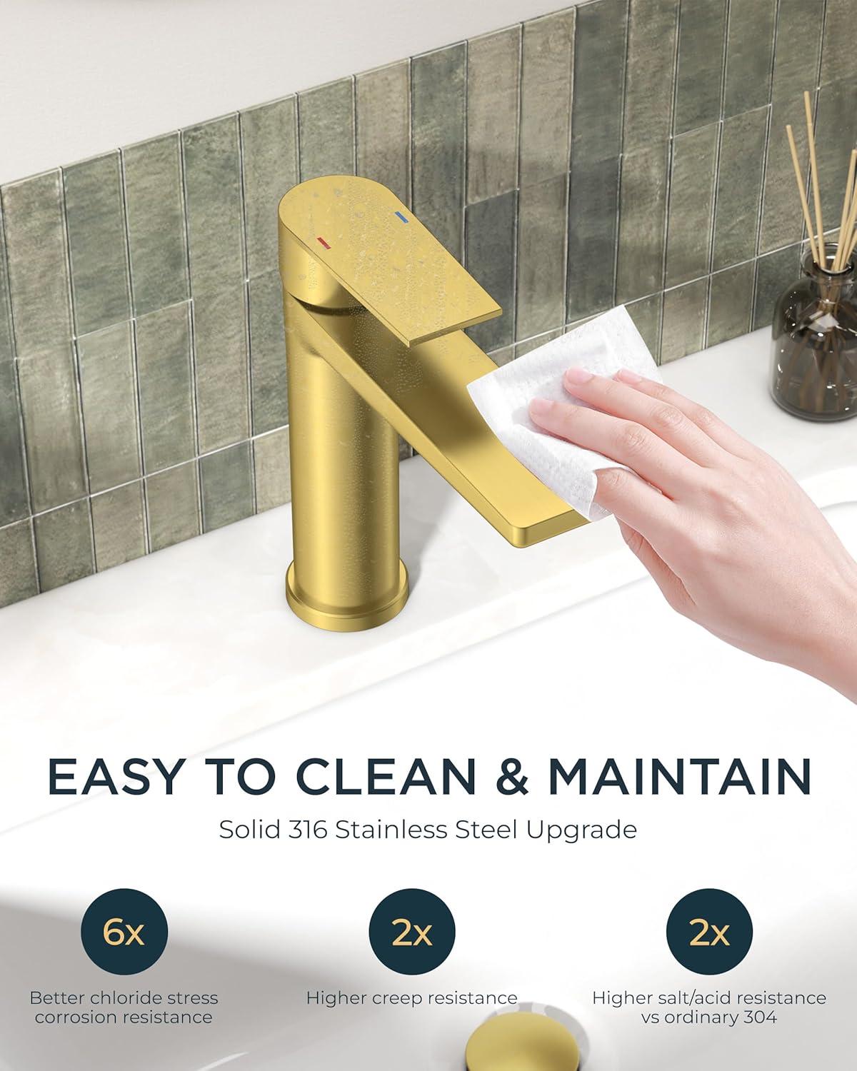 UPGRADED: Upgraded 316 SS gold faucet bathroom offers double the rust resistance, passing 36h acid salt spray test. Enhanced surface technology increases firmness/stability by 6x – cleans with a light wipe. Flow rate: 1.2gpm/4.5L/min at Max 60psi