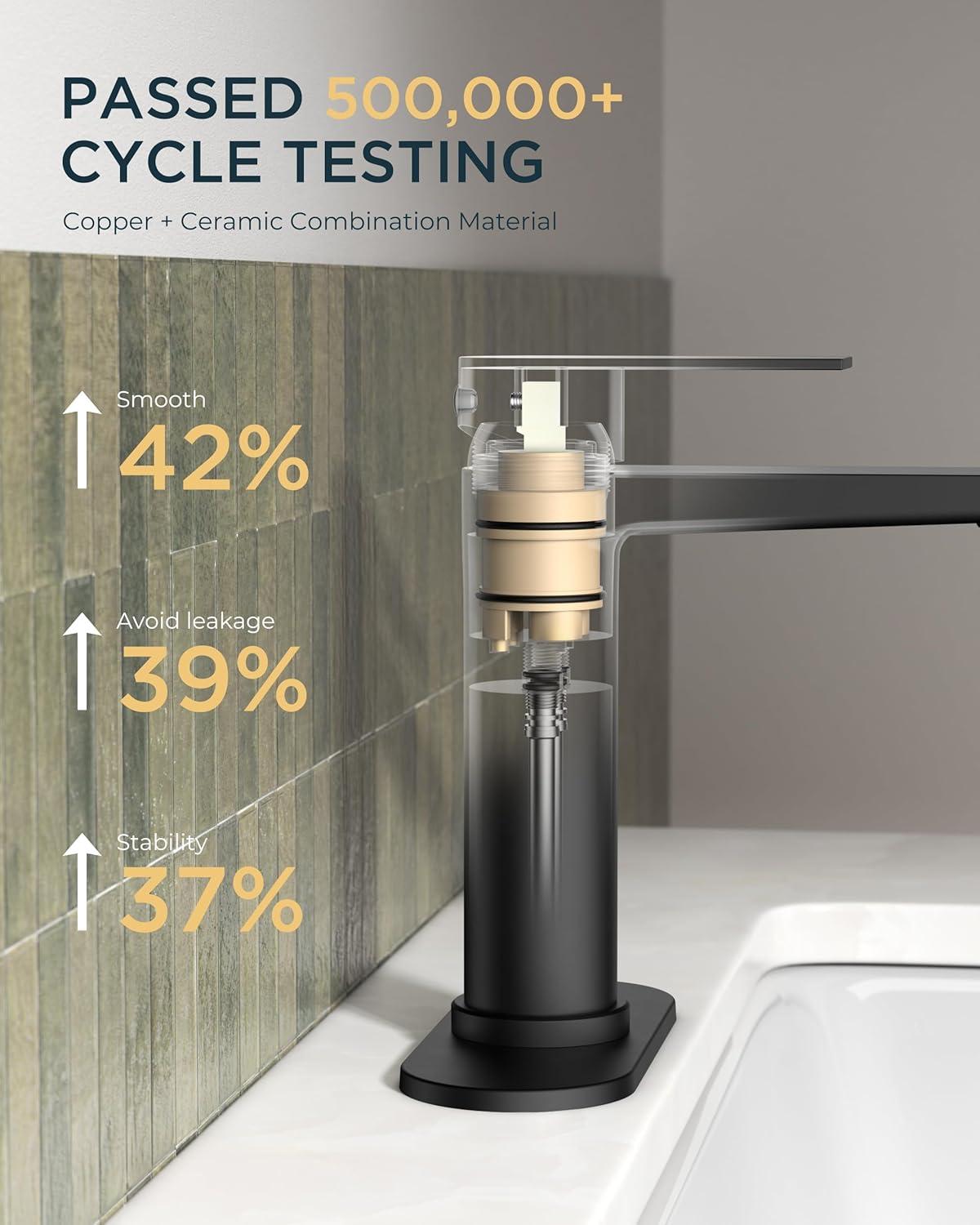 CERTIFIED DURABILITY & SAFETY: The gole bathroom faucet complies with NSF, CUPC, DOE, CEC certification standards to ensure clean and safe water. High-sealing commercial ceramic disc cartridge tested to 500,000 cycles ensures brushed gold bathroom faucet drip-free durability