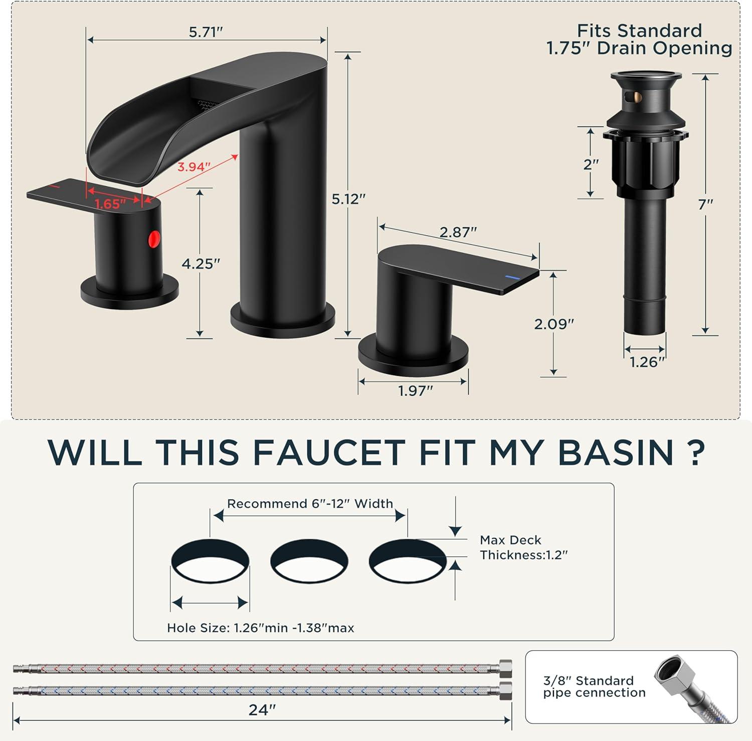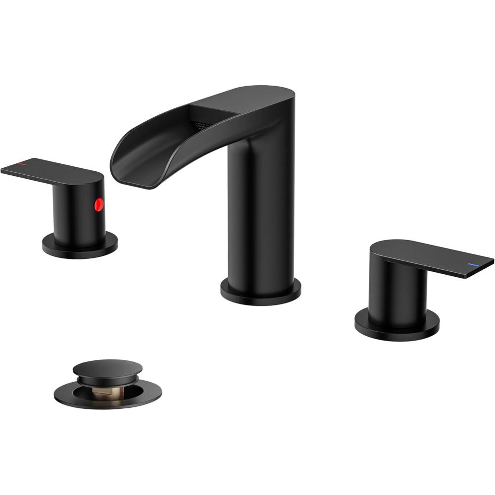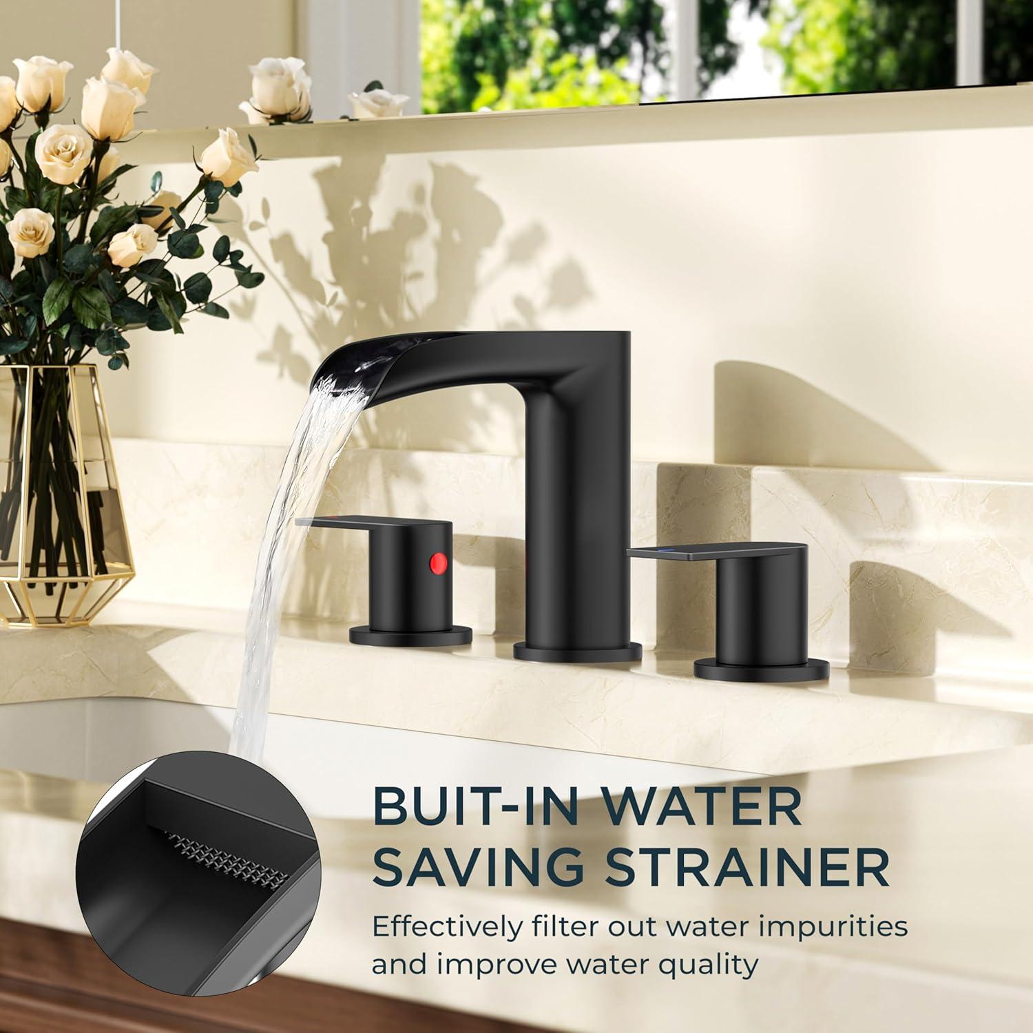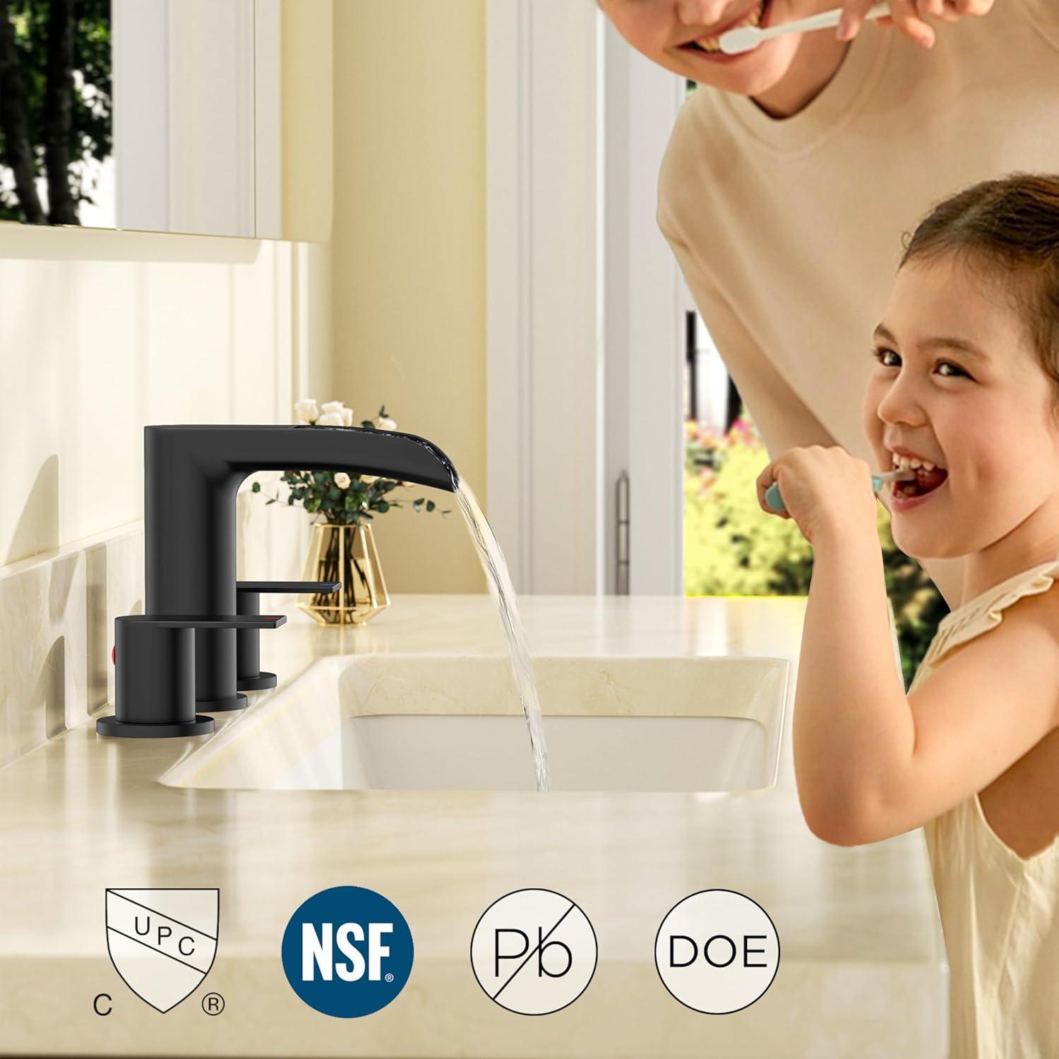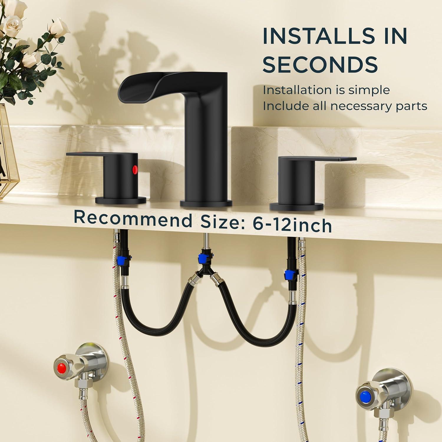 FORIOUS Gold Bathroom Faucet, Waterfall Bathroom Faucet for Sink 3 Hole with Easy Install Pop-Up Drain and Water Supply, 8 Inch Widespread for Vanity, Camper,Restroom(Matte Black)