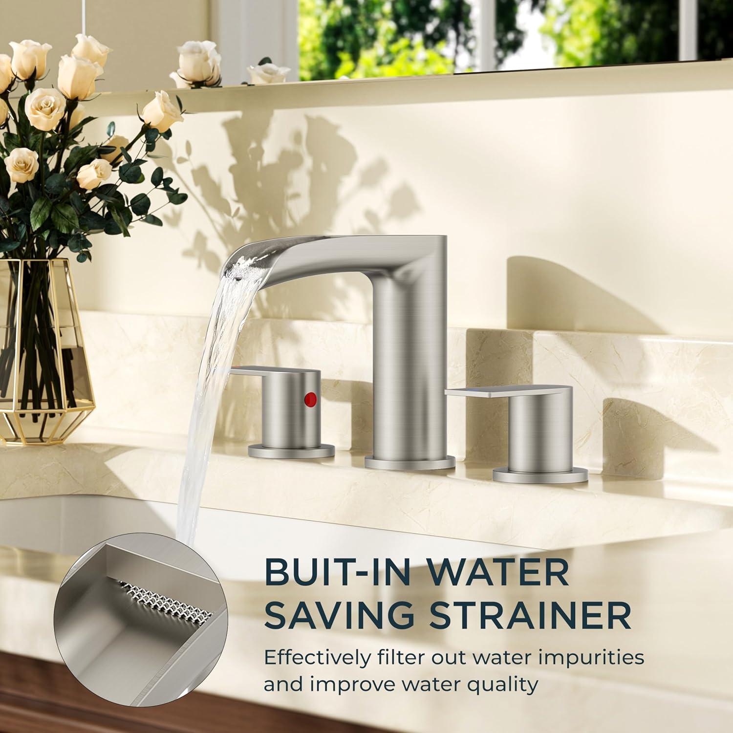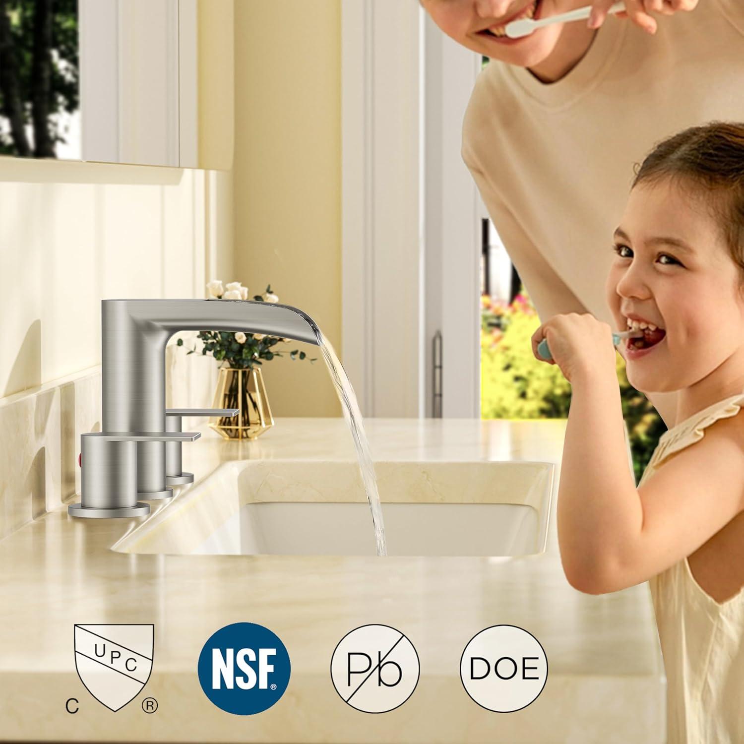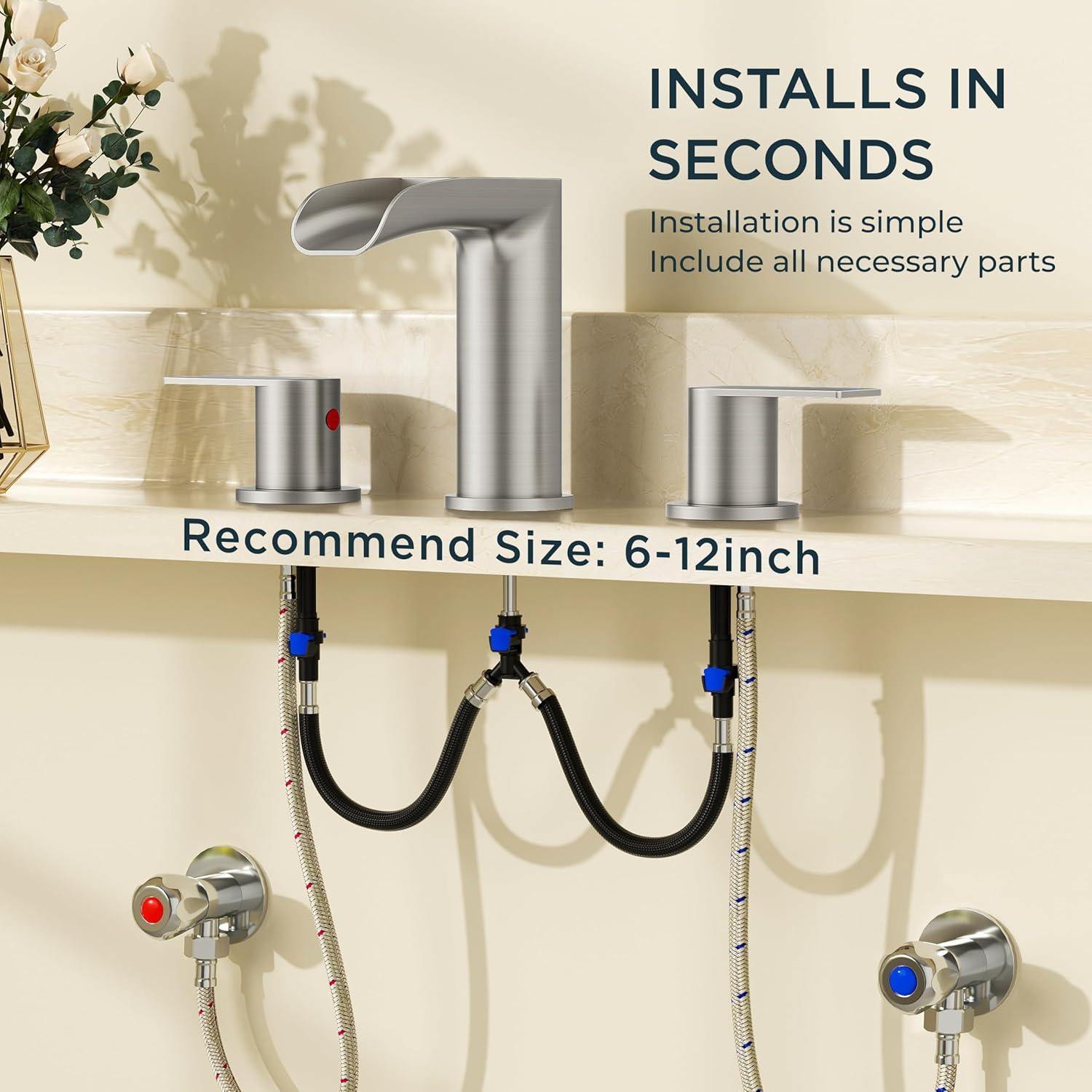 FORIOUS Gold Bathroom Faucet, Waterfall Bathroom Faucet for Sink 3 Hole with Easy Install Pop-Up Drain and Water Supply, 8 Inch Widespread for Vanity, Camper,Restroom(Stainless Steel)