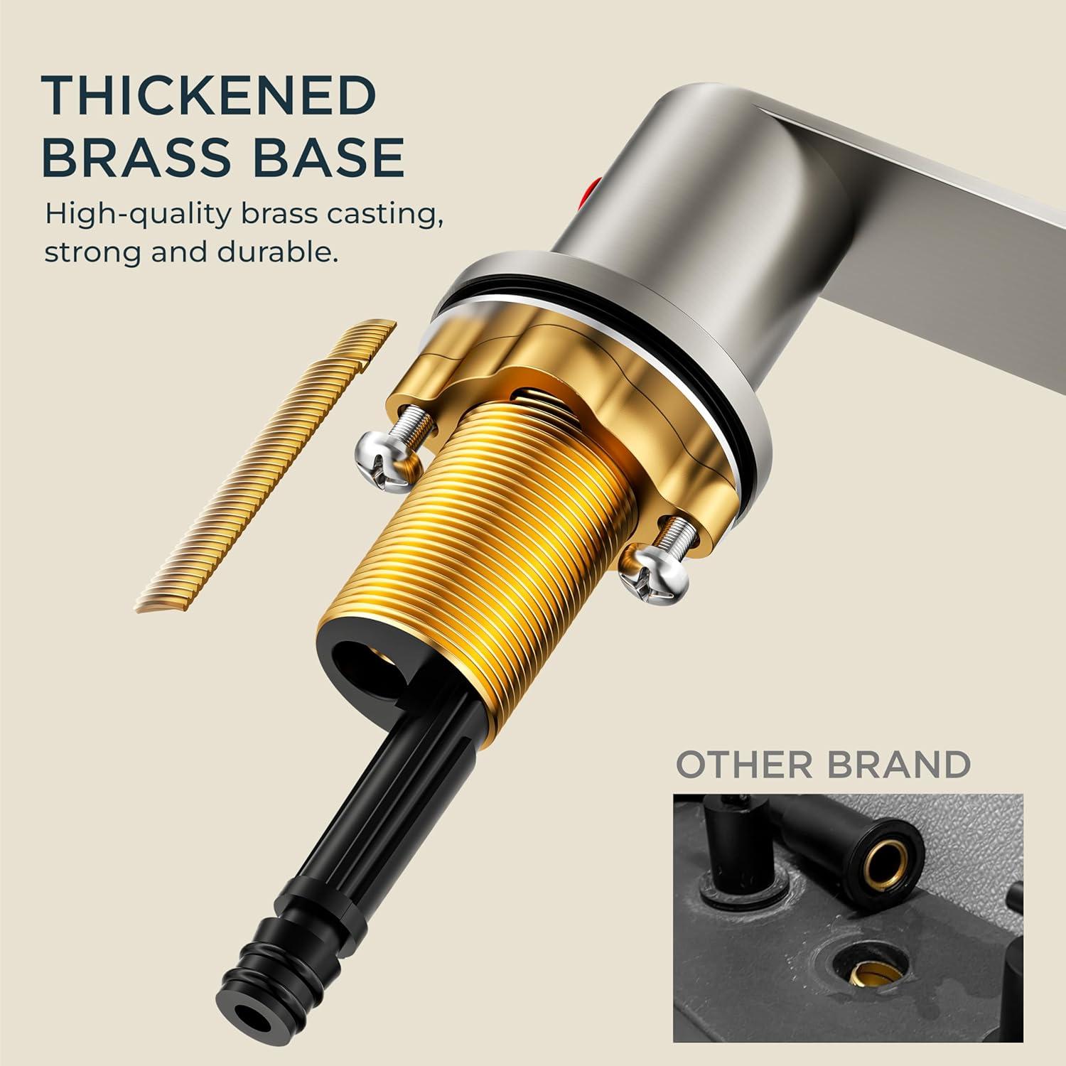 Multi-Style & 24/7 Service: From modern to rustic, the bathroom sink faucet 3 hole complements various style. Available in three color options: brushed nickel, matte black, or brushed gold. Besides, 24/7 customer support is provided, including installation guidance or accessory replacement services.
