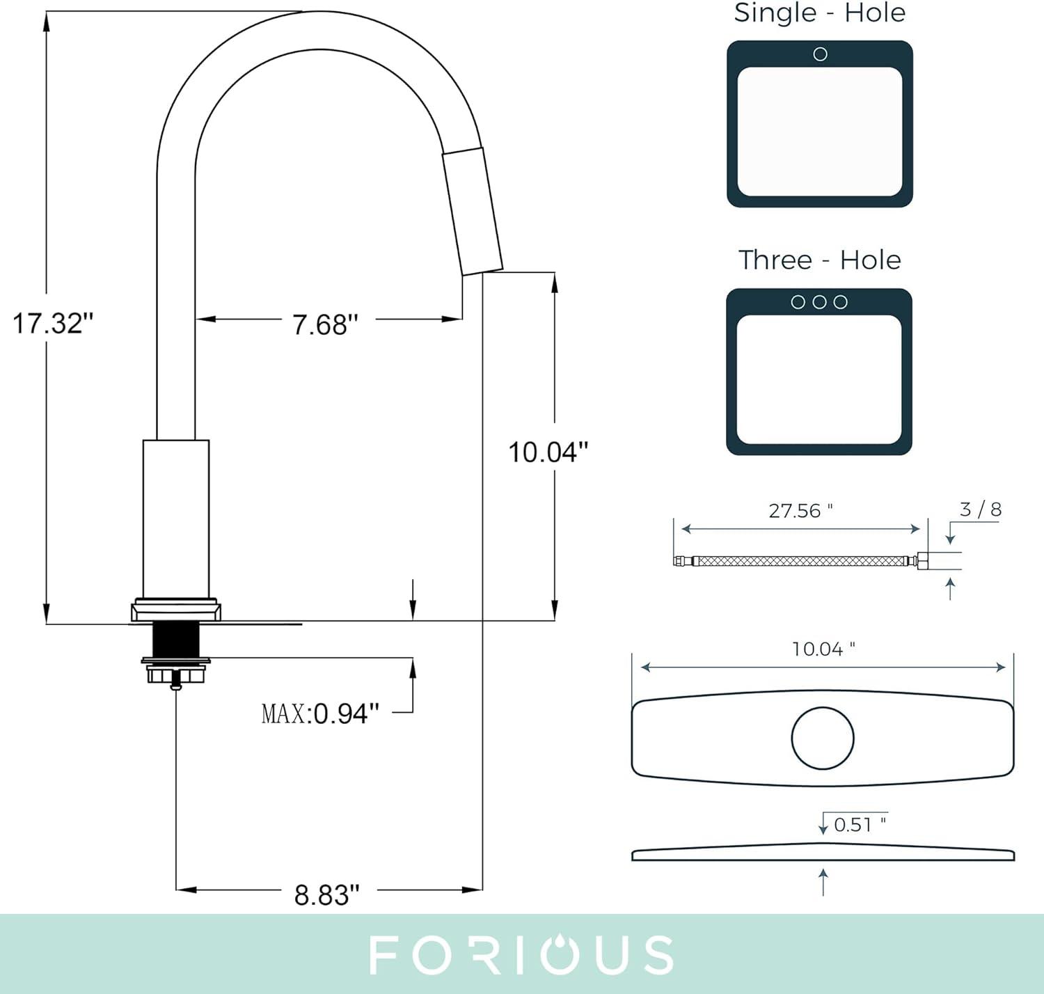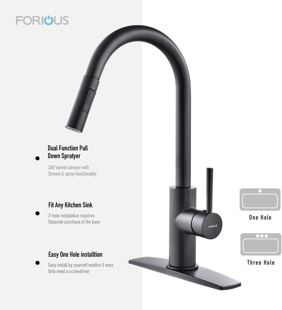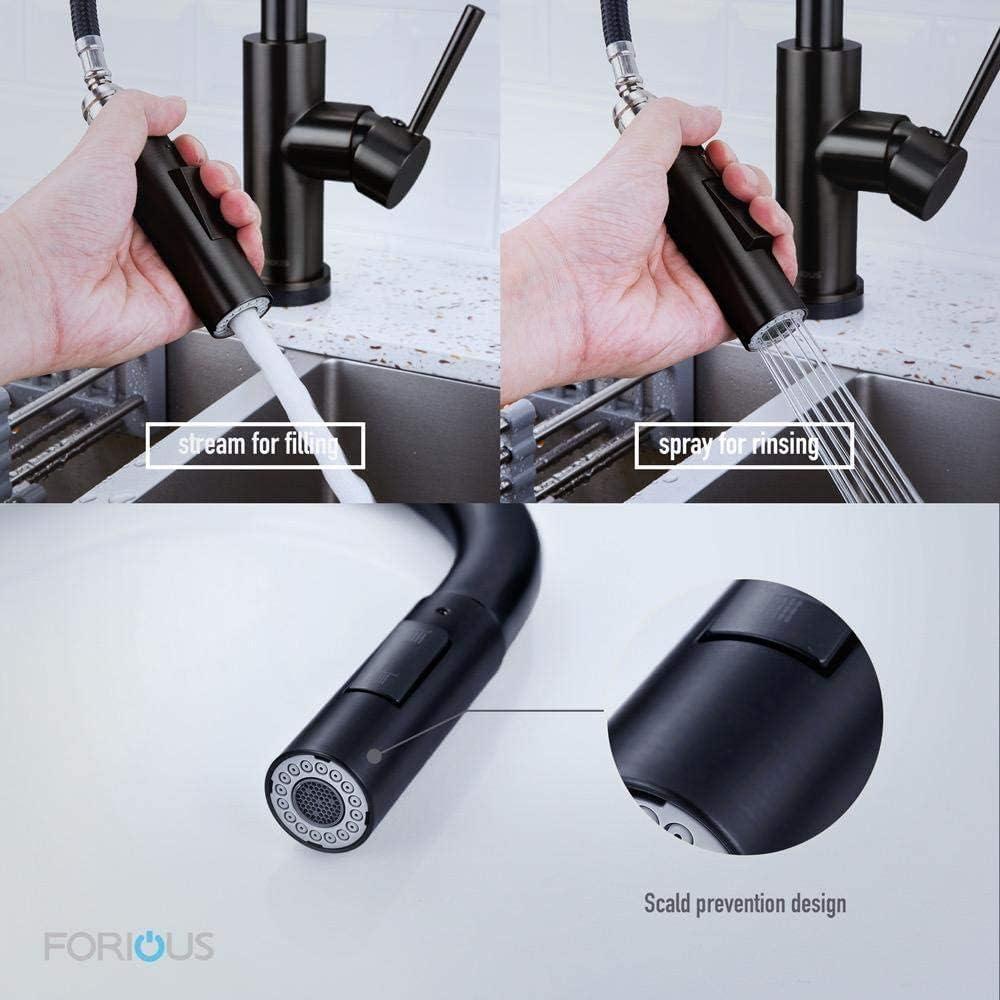 More Spacious Space: The kitchen faucet with pull-down sprayer can be pulled out 17.7 inches, easily reaching anywhere in the sink. FORIOUS kitchen sink faucet can rotate 360 °, regardless of the angle of restriction, single and double sinks can be used