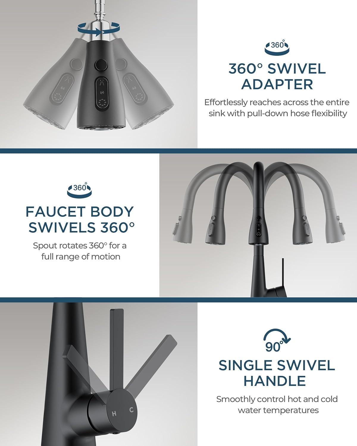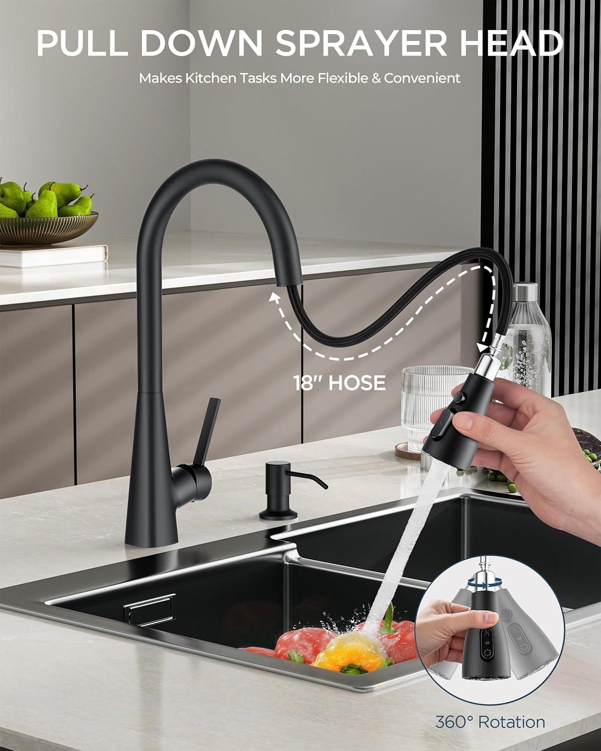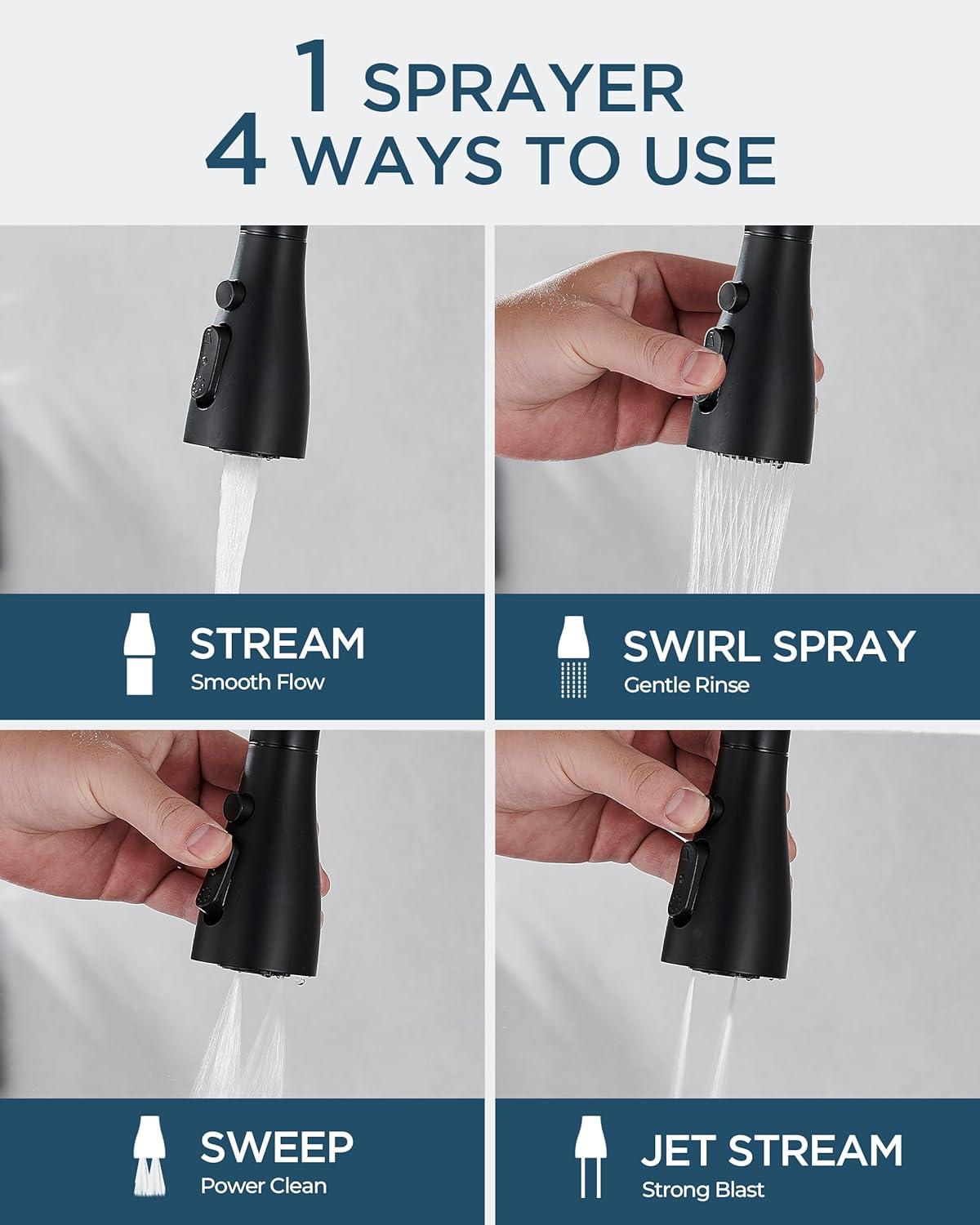 4-Function Pull-Down Sprayer: Choose from soft stream, swirl spray, power wash, or dual jet streams—whether rinsing produce, washing dishes, or tackling stubborn residue.The Forious kitchen faucet with sprayer features a 360° rotating spray head and an 18-inch flexible hose, providing unmatched flexibility to effortlessly tackle any kitchen task in every corner of your sink