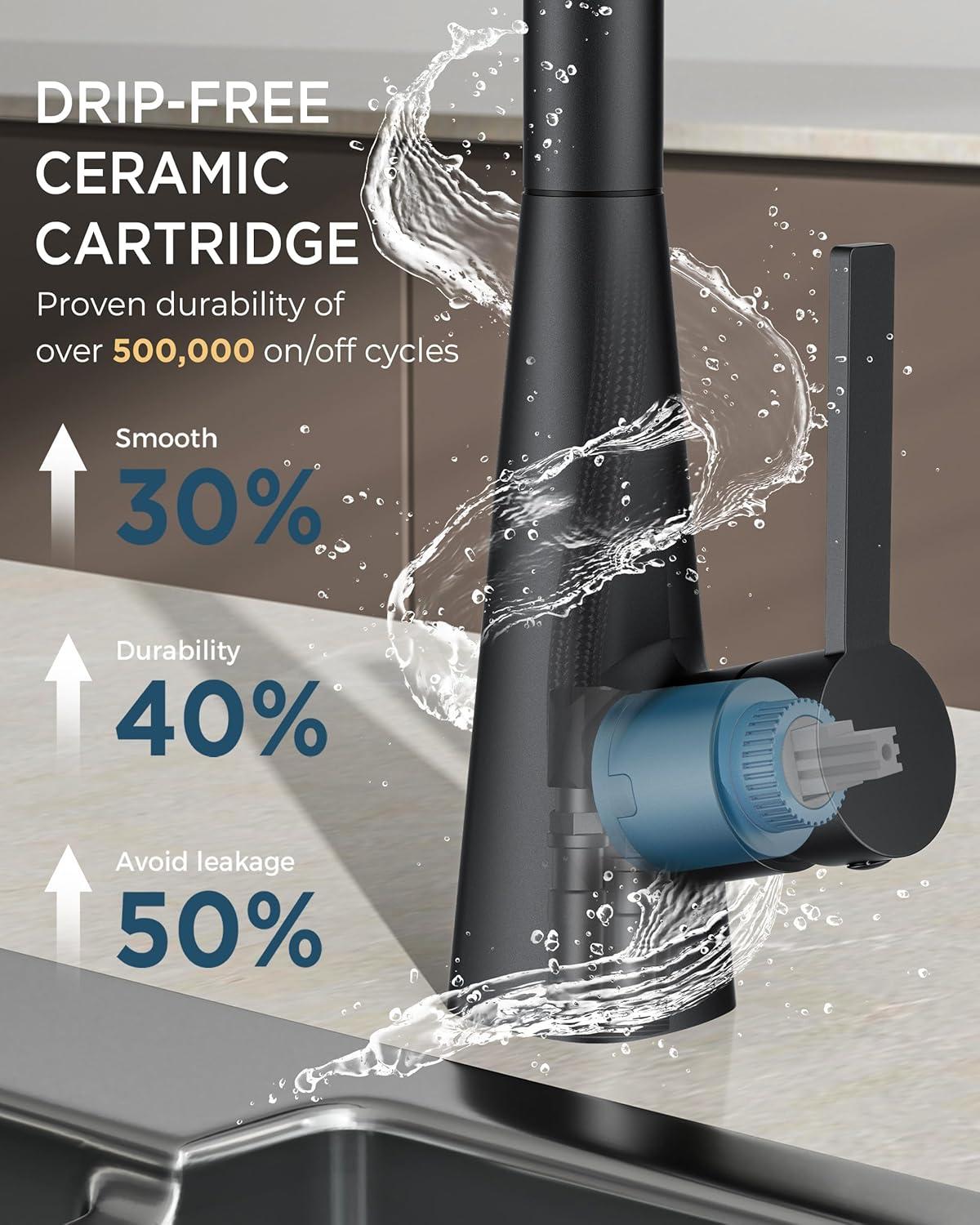 Premium Materials & Reliable Leak-Resistant Design: Crafted with a corrosion-resistant SUS 304 stainless steel body for exceptional longevity, our kitchen faucet with pull down sprayer features a lead-free ceramic cartridge. Rigorously tested to withstand over 500,000+ cycles, this high-performance valve ensures dependable, leak-free operation for years to come