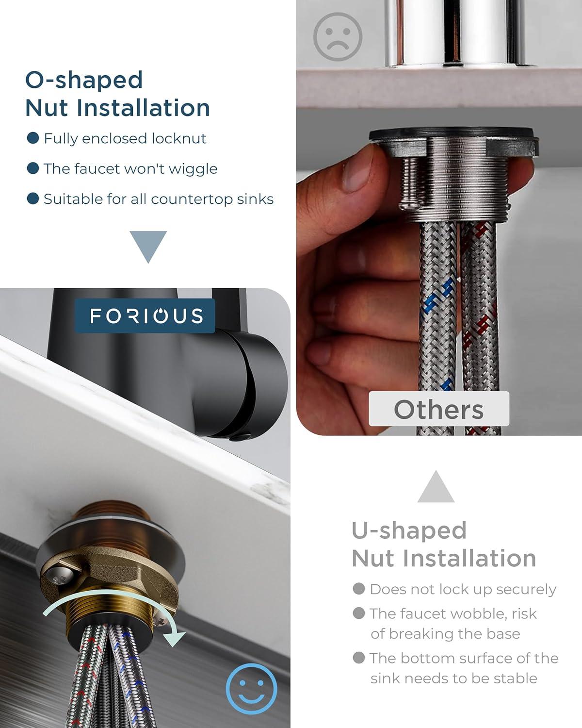 Elegant High-Arc Design & Universal Fit: Forious brushed nickel kitchen faucet features a stylish gooseneck spout that combines elegance with space-saving utility. The included detachable deck plate ensures compatibility with both 1-hole and 3-hole sinks, delivering exceptional value while enhancing your kitchen's style