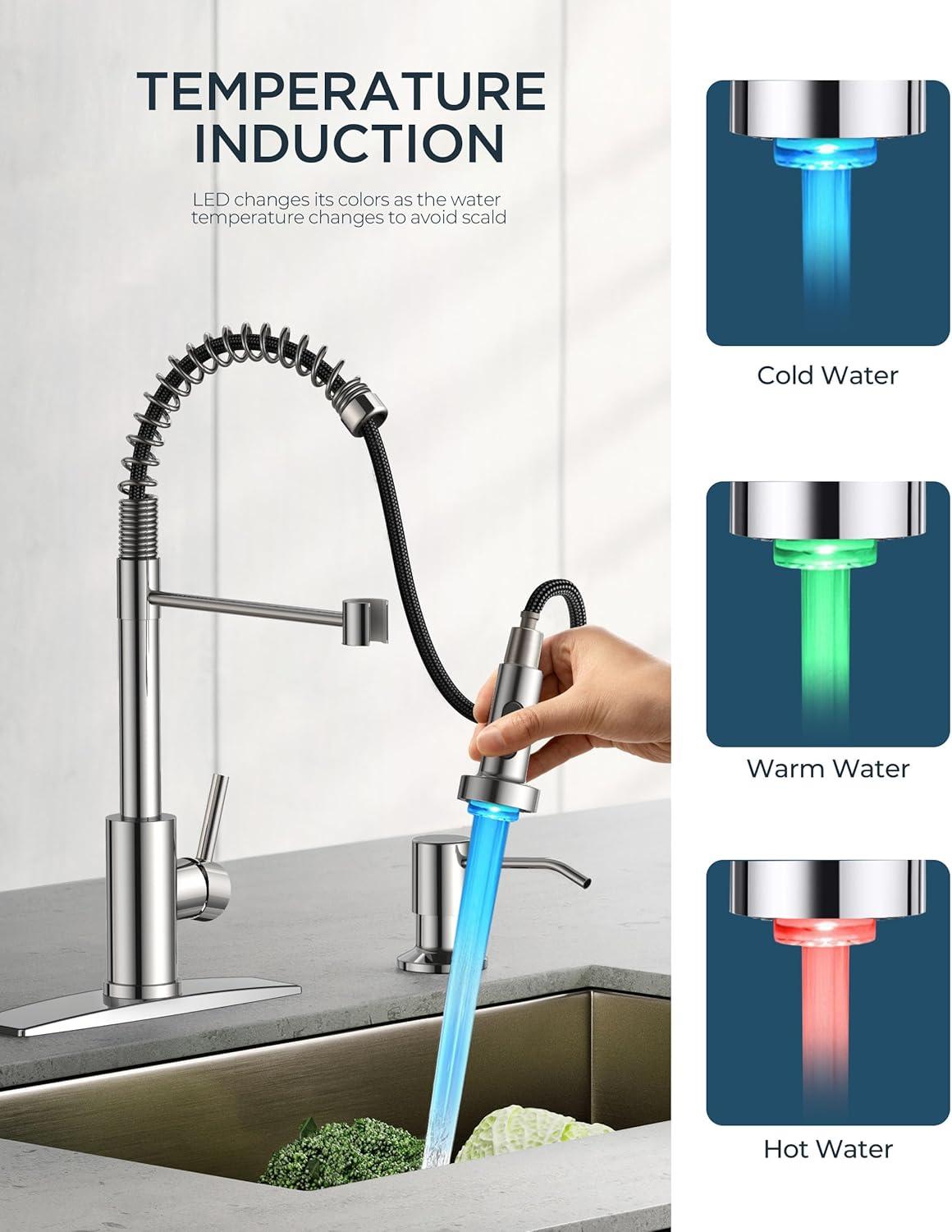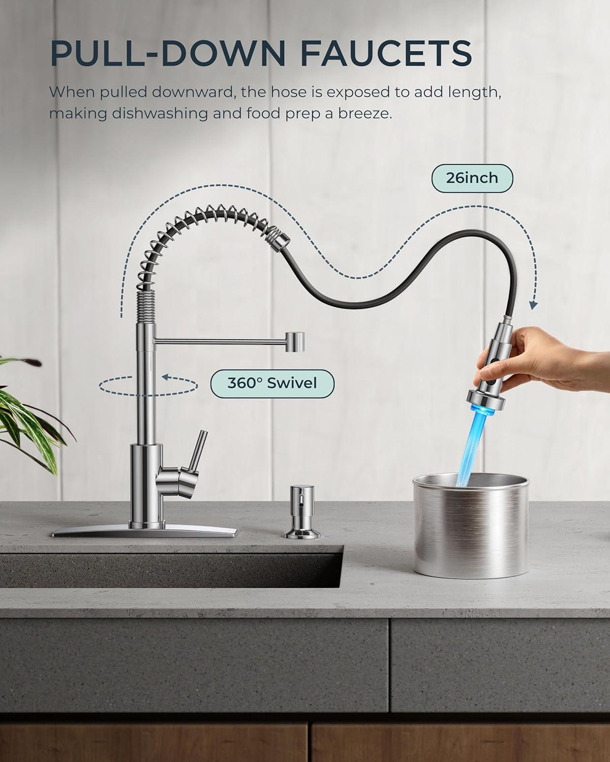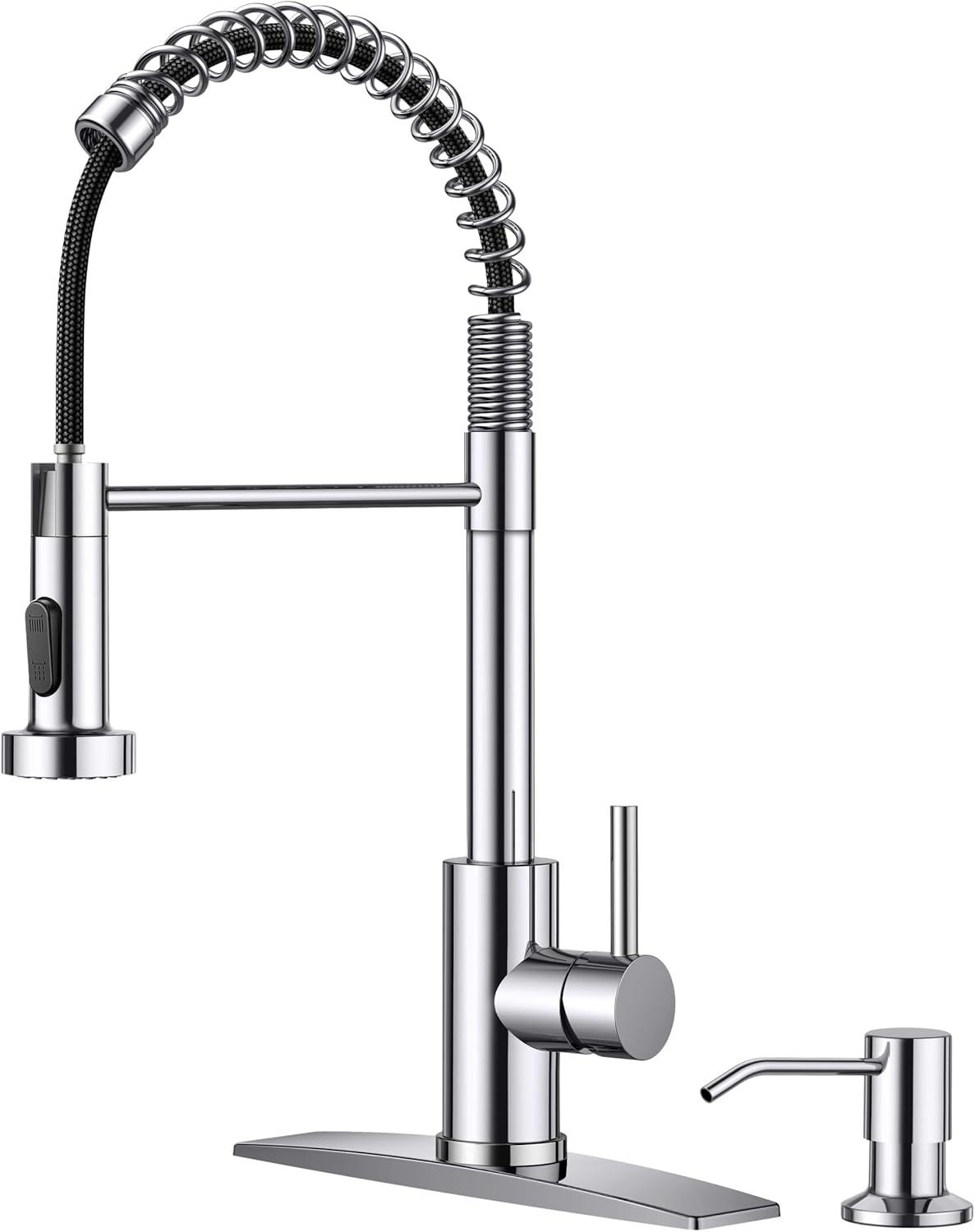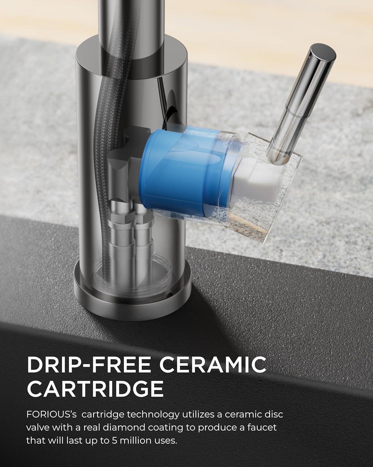 Premium Quality: Made from SUS 304 stainless steel, this kitchen faucet meets lead-free standards. It features five layers of nanotechnology plating for durability and a ceramic cartridge tested over 5,000,000 times to ensure leak-proof performance