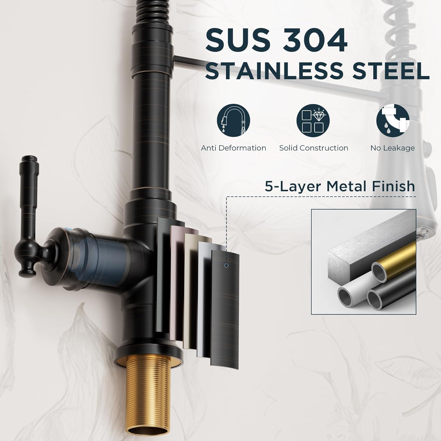 Premium Quality: Made from SUS 304 stainless steel, this kitchen faucet meets lead-free standards. It features five layers of nanotechnology plating for durability and a ceramic cartridge tested over 5,000,000 times to ensure leak-proof performance