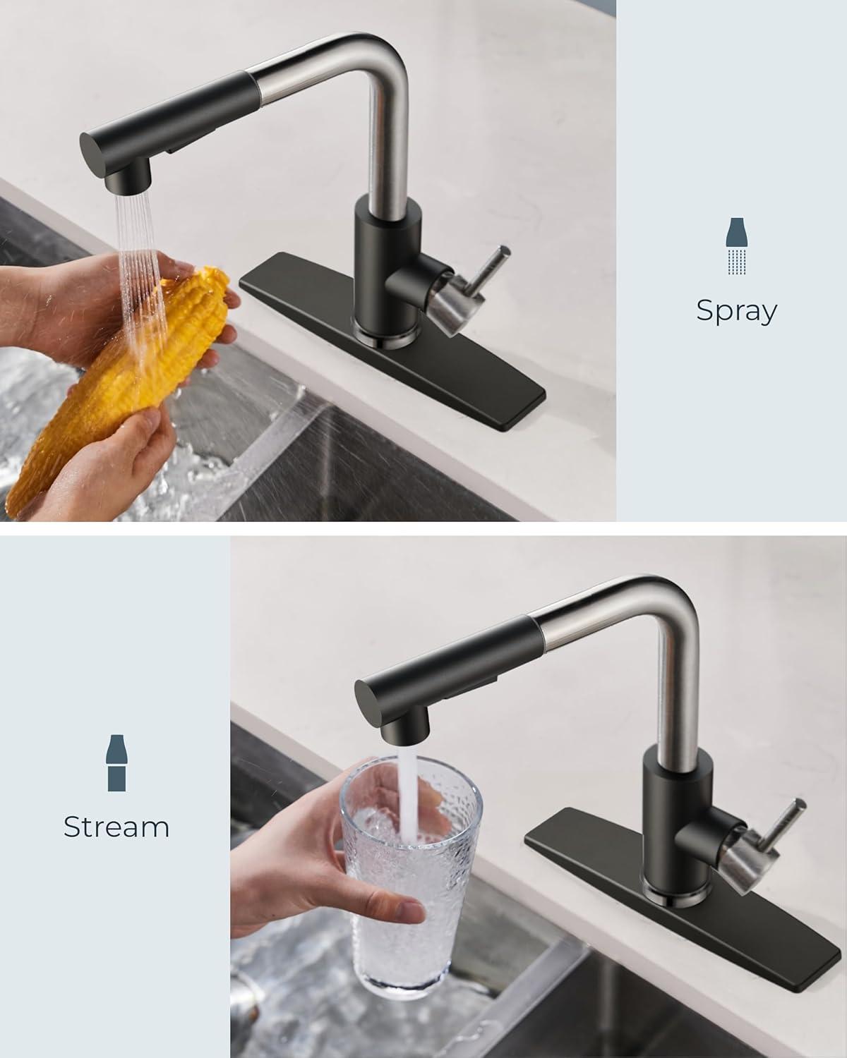 Versatile Control: Our kitchen faucet with pull down sprayer offers tailored water flow with two modes: Stream and Spray for everyday tasks, and a single handle for precise control over temperature and volume
