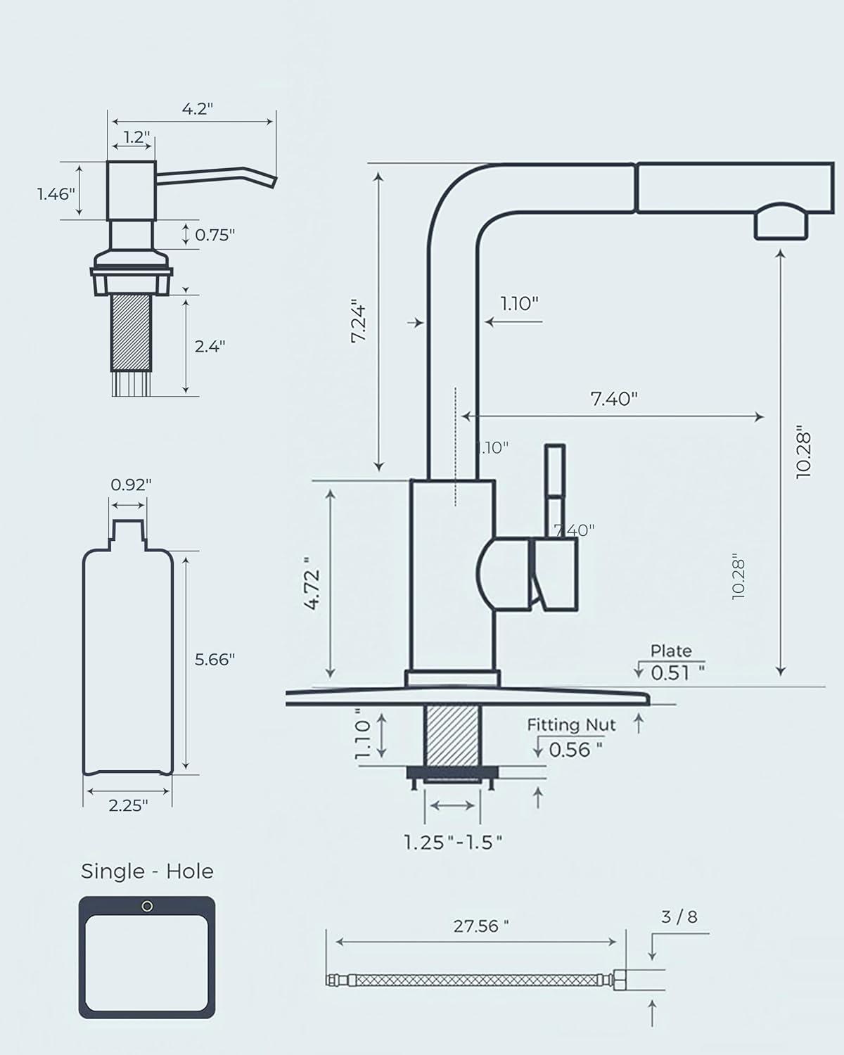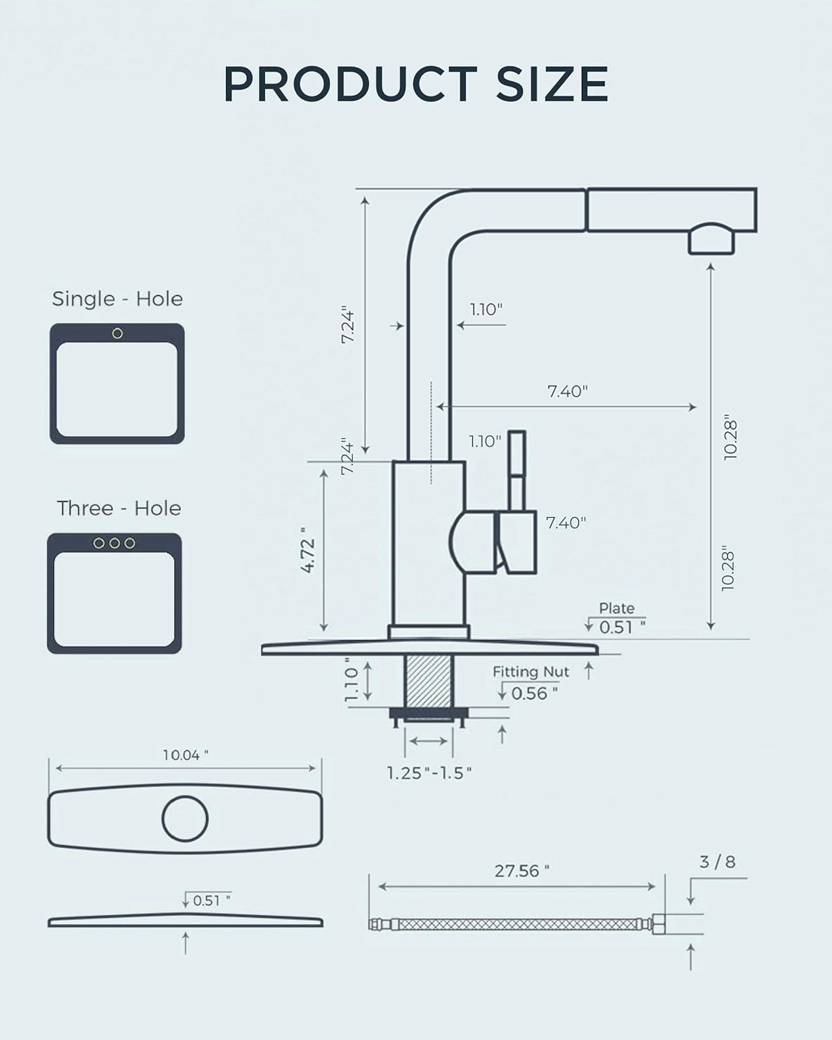 Ideal for Various Locations: This pull out kitchen faucet is compact with a height of 11.96″ and a spout height of 10.28″, it fits perfectly in any space, such as kitchen sinks, laundry rooms, RVs, bars, and more