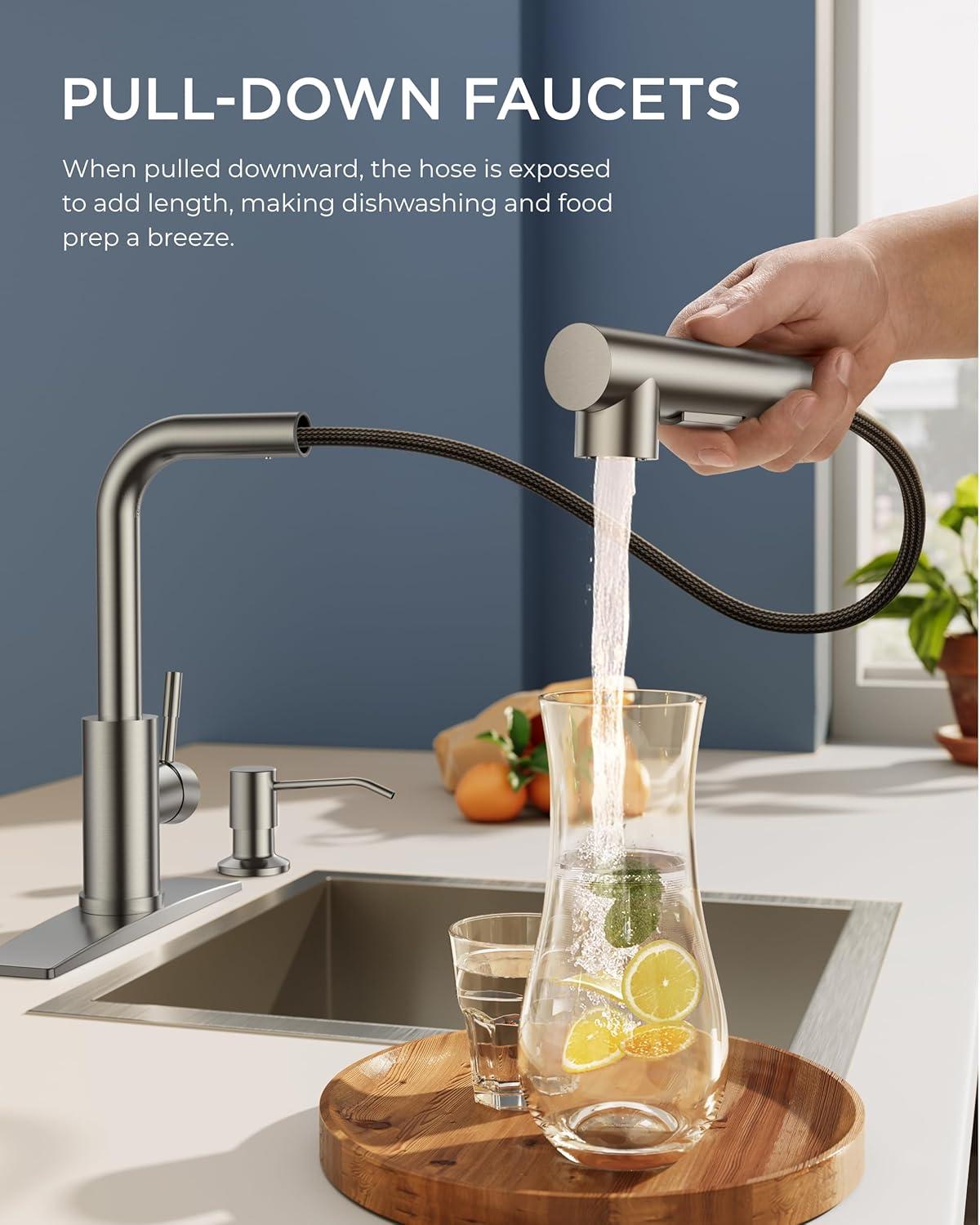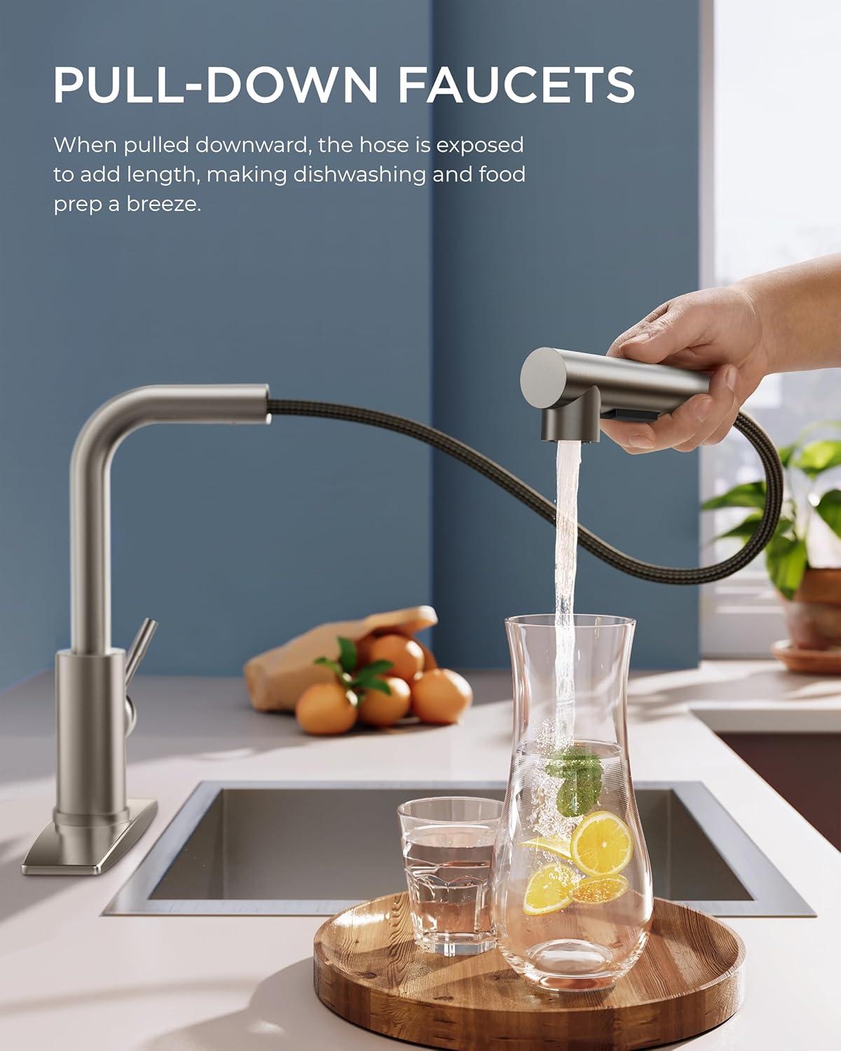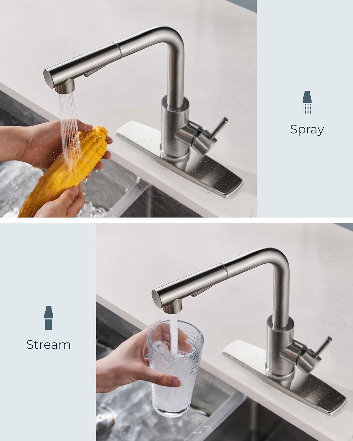 Versatile Control: Our kitchen faucet with pull down sprayer offers tailored water flow with two modes: Stream and Spray for everyday tasks, and a single handle for precise control over temperature and volume