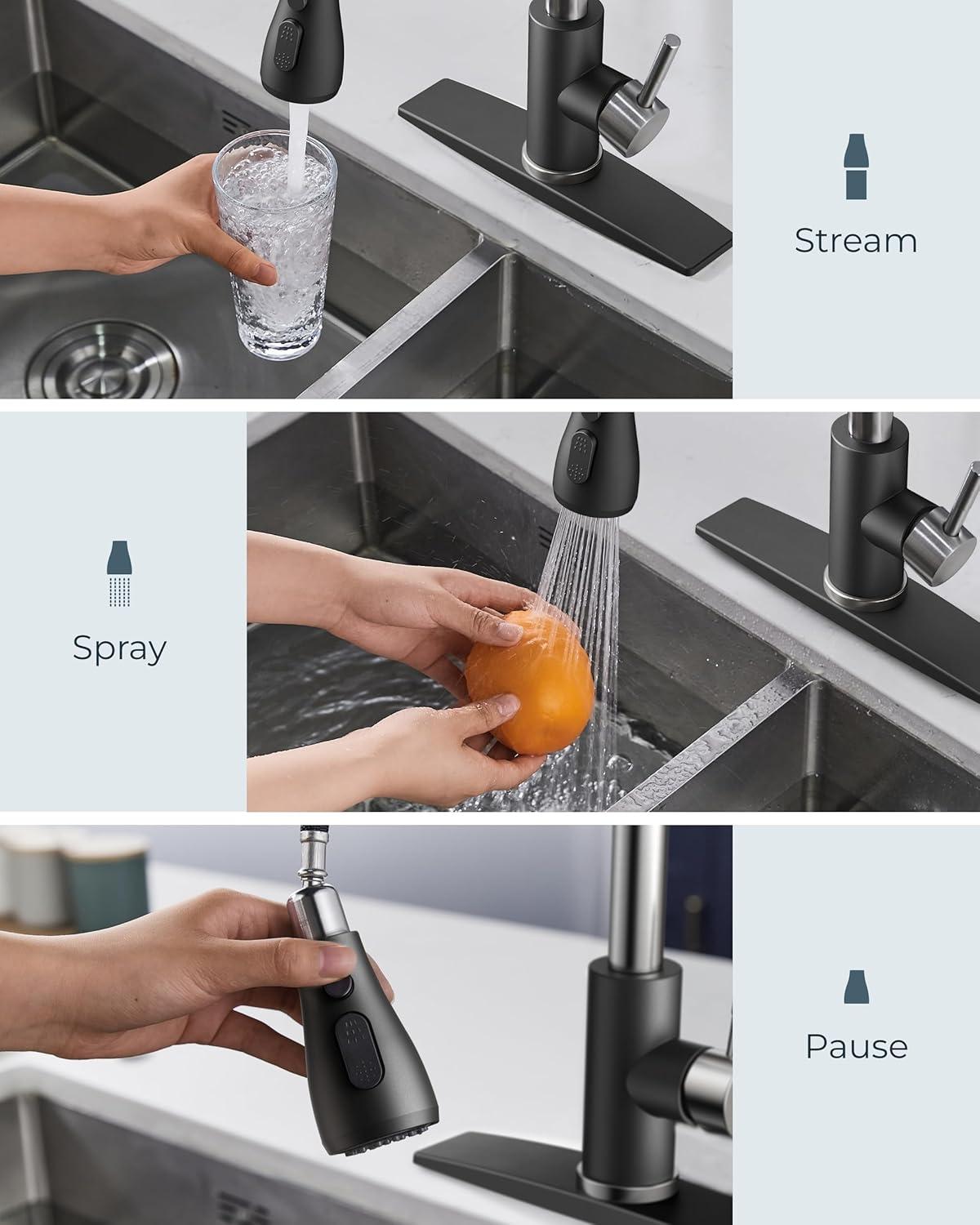 3 Spray Modes: This faucet has three settings (Stream, Spray, Pause) for various cleaning. An 18-inch retractable hose and 360° swivel spout fit single/dual sinks, offering enough space for kitchen jobs (Flow Rate: 1.8gpm/6.8L/min at Max 80psi)