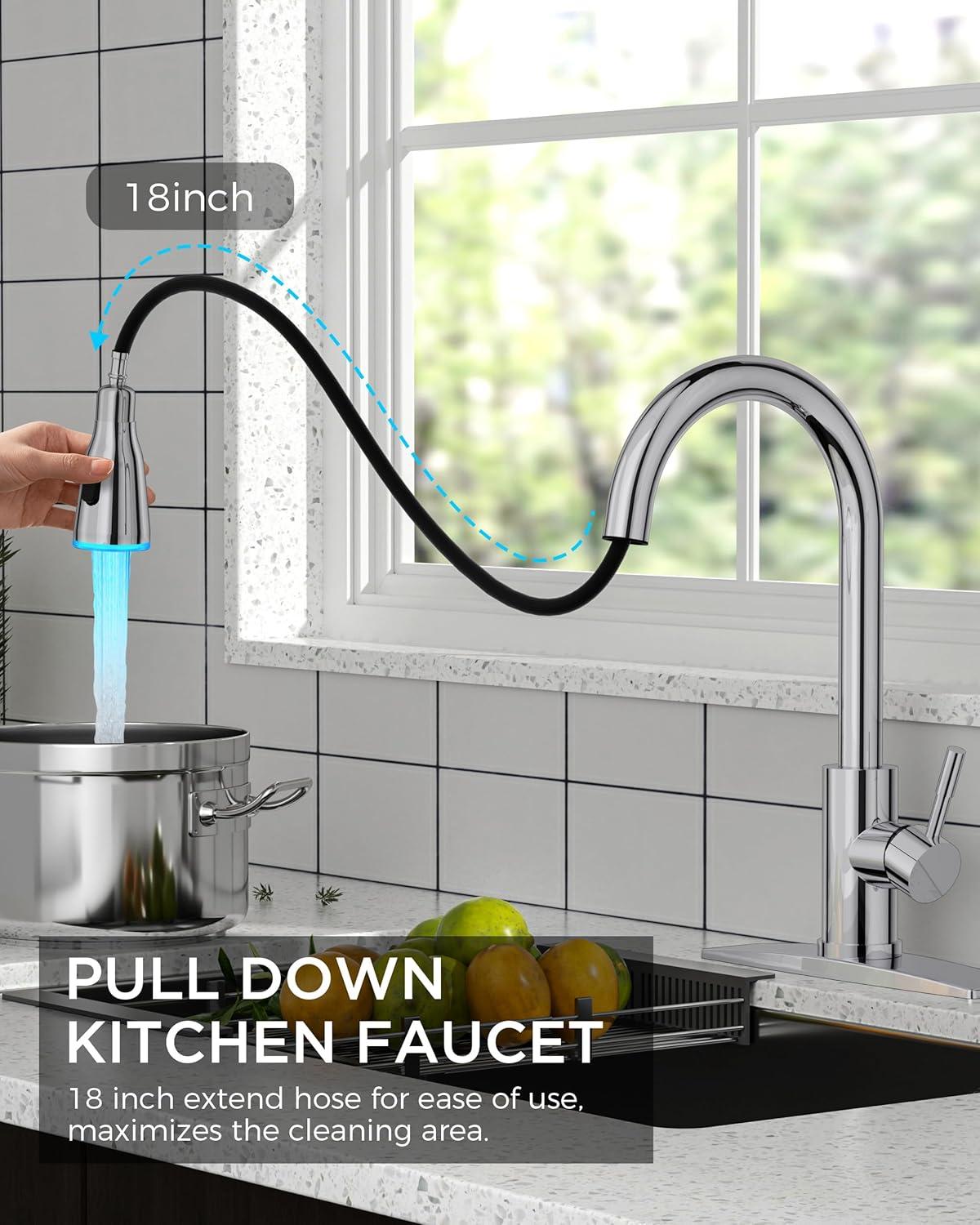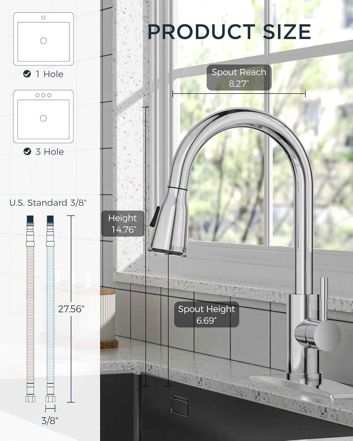 3 Spray Modes: This faucet has three settings (Stream, Spray, Pause) for various cleaning. An 18-inch retractable hose and 360° swivel spout fit single/dual sinks, offering enough space for kitchen jobs (Flow Rate: 1.8gpm/6.8L/min at Max 80psi)