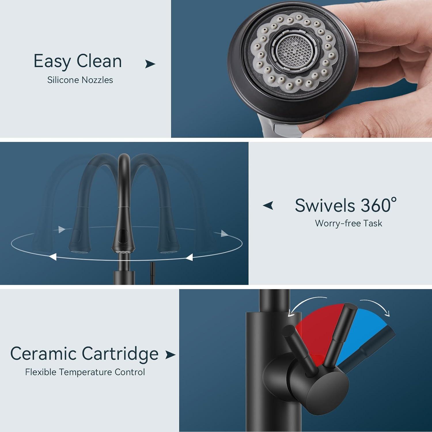 Superior Quality: Crafted from no-lead SUS 304 stainless steel, the kitchen faucet features drip-free ceramic cartridges and high-temp PEX hoses, preventing leaks and ensuring long-lasting durability and safety