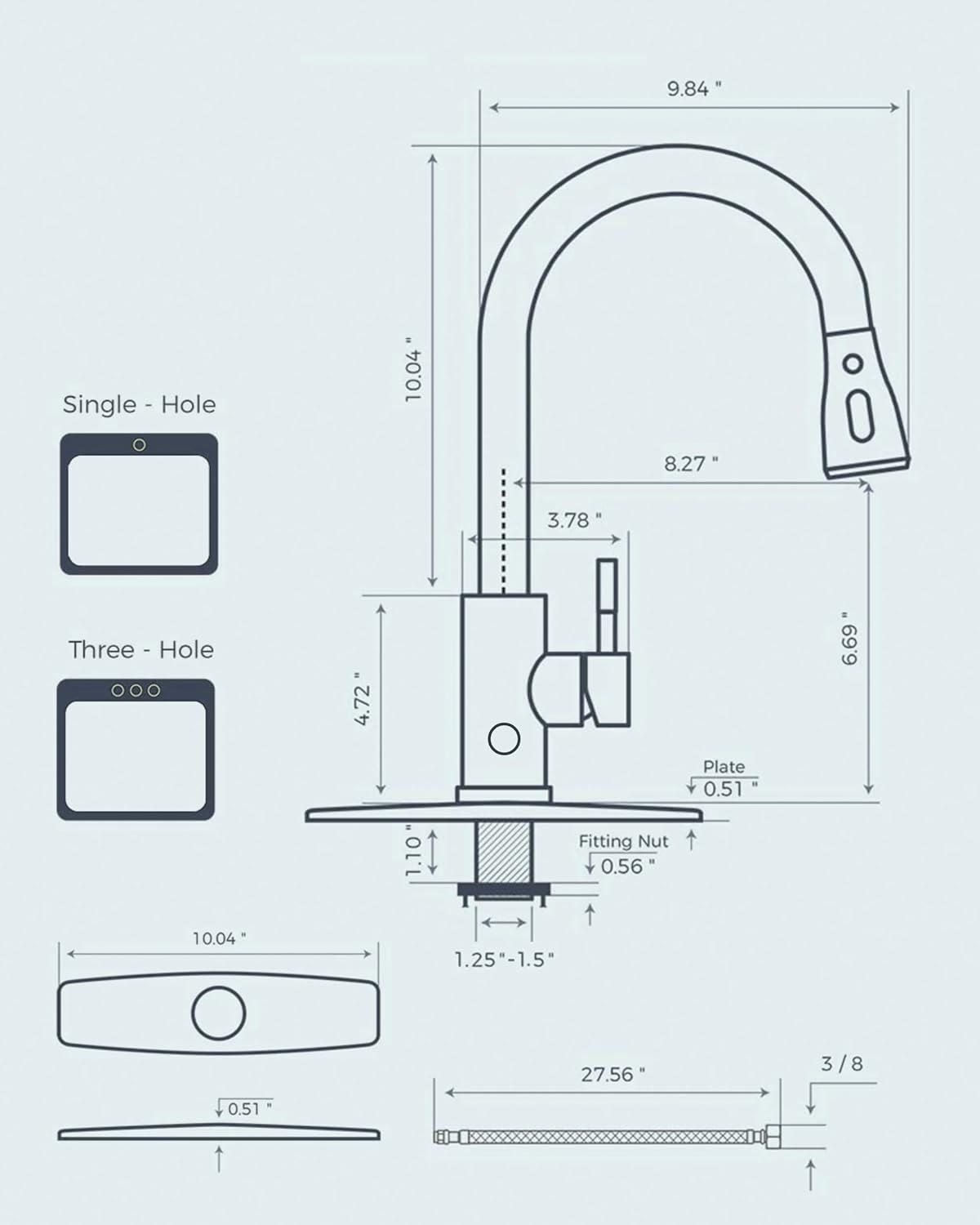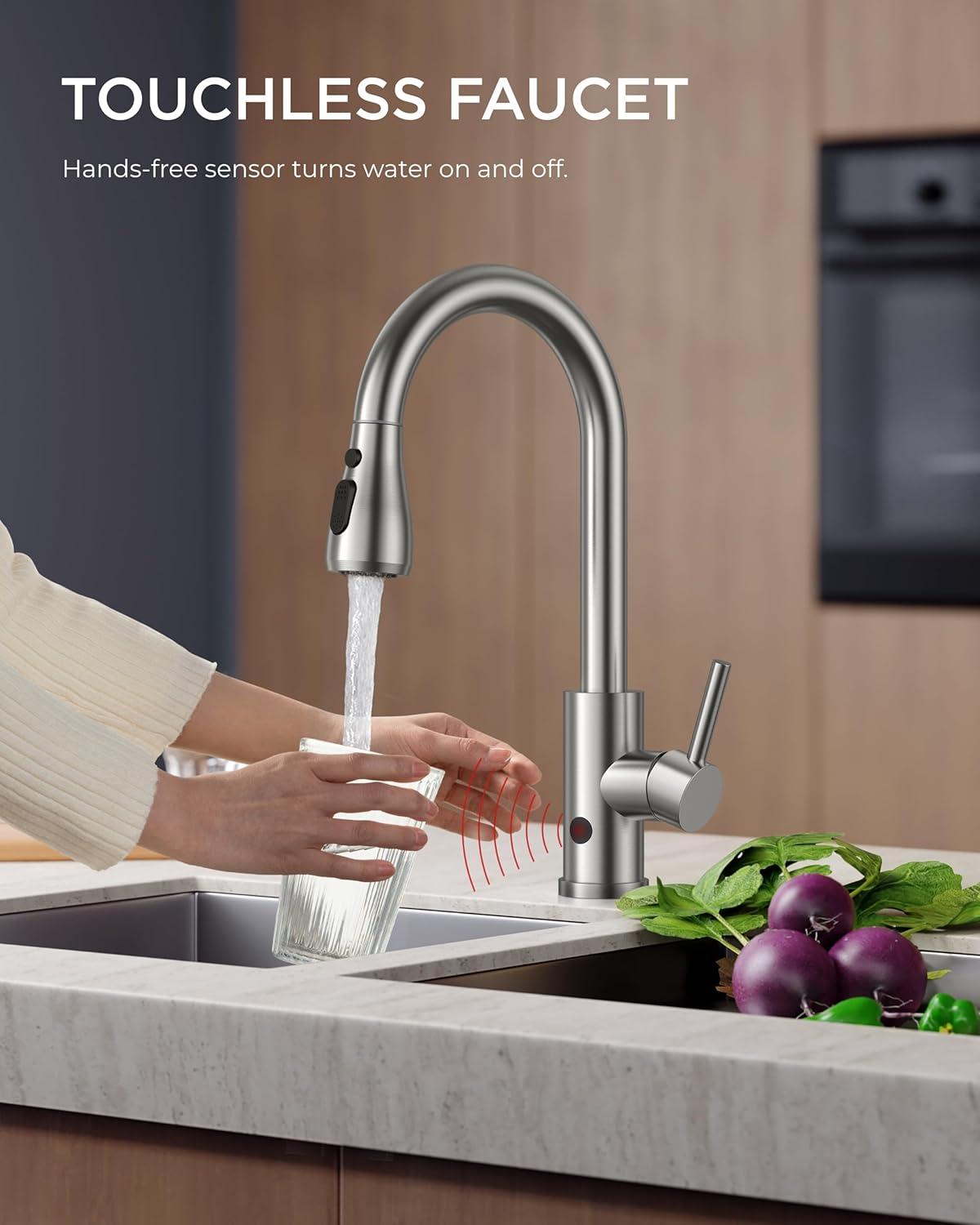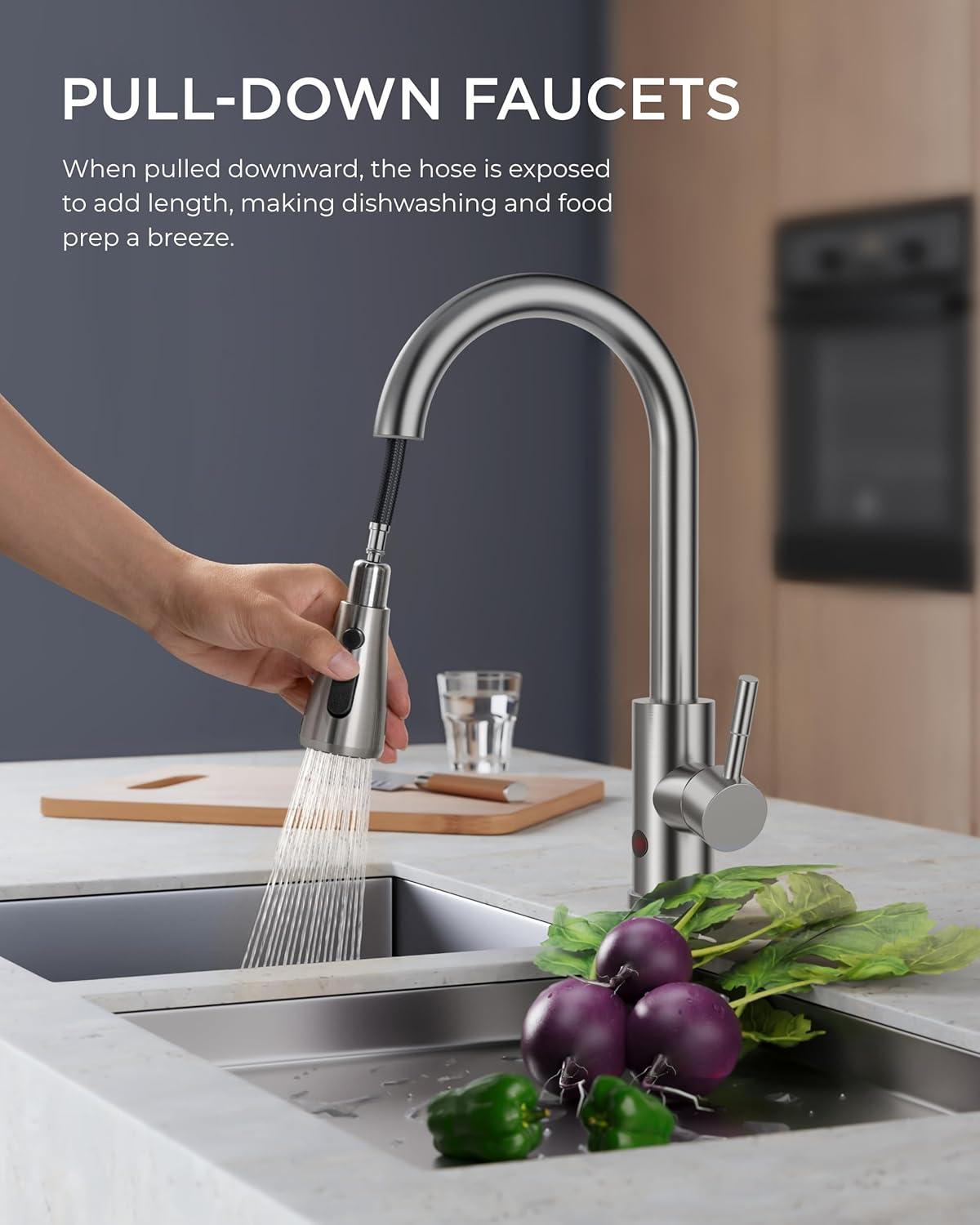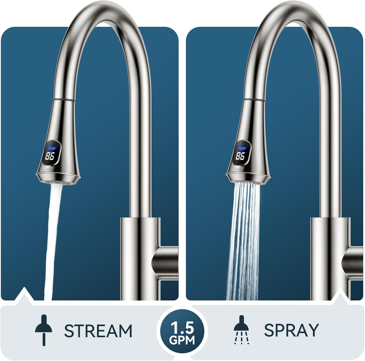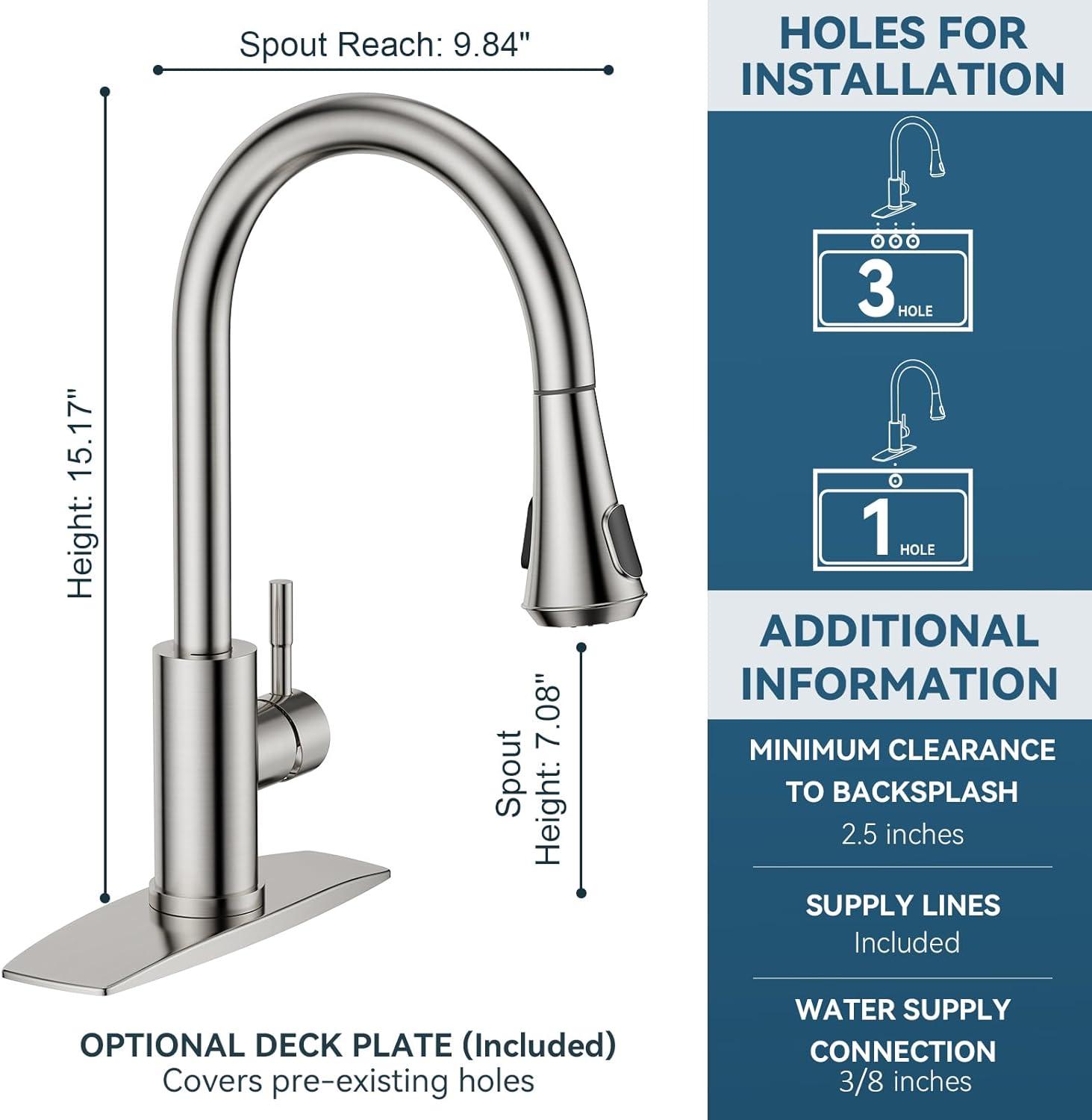 3 Spray Modes: This faucet has three settings (Stream, Spray, Pause) for various cleaning. An 18-inch retractable hose and 360° swivel spout fit single/dual sinks, offering enough space for kitchen jobs (Flow Rate: 1.8gpm/6.8L/min at Max 80psi)