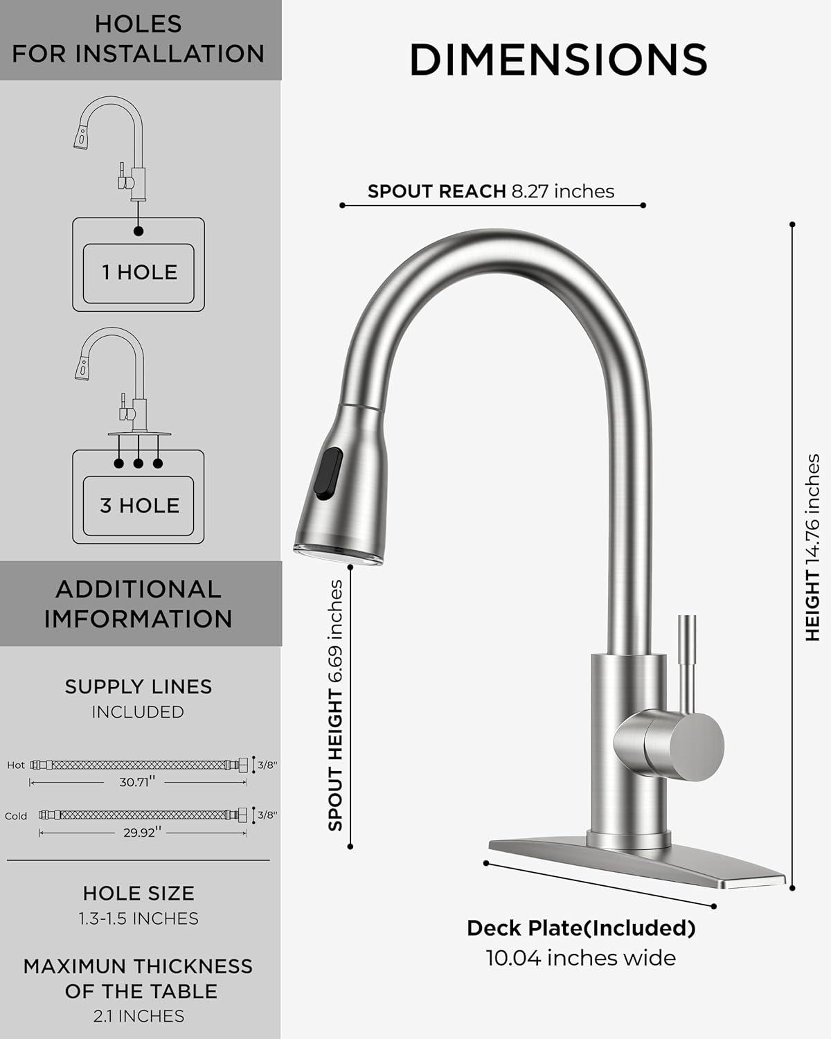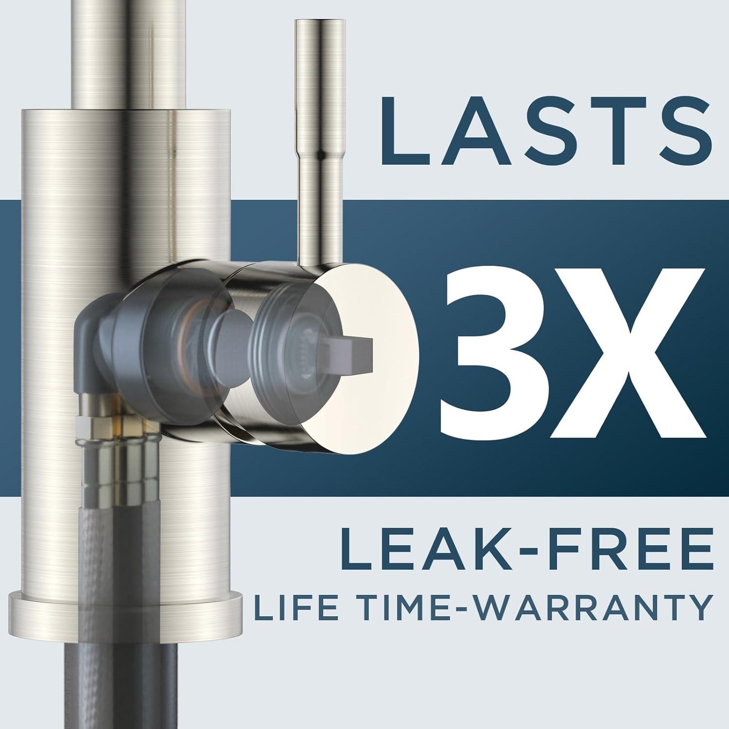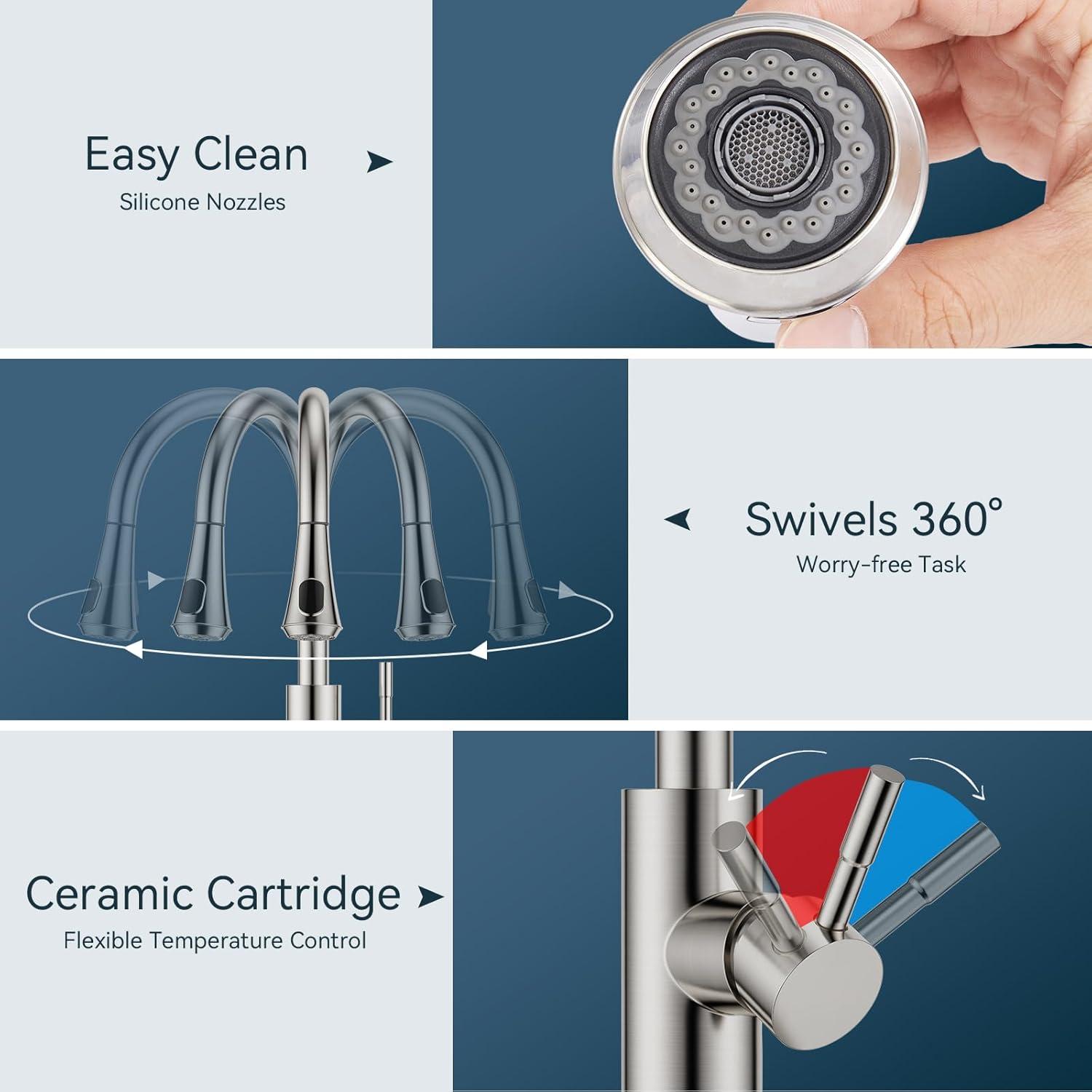 Superior Quality: Crafted from no-lead SUS 304 stainless steel, the kitchen faucet features drip-free ceramic cartridges and high-temp PEX hoses, preventing leaks and ensuring long-lasting durability and safety