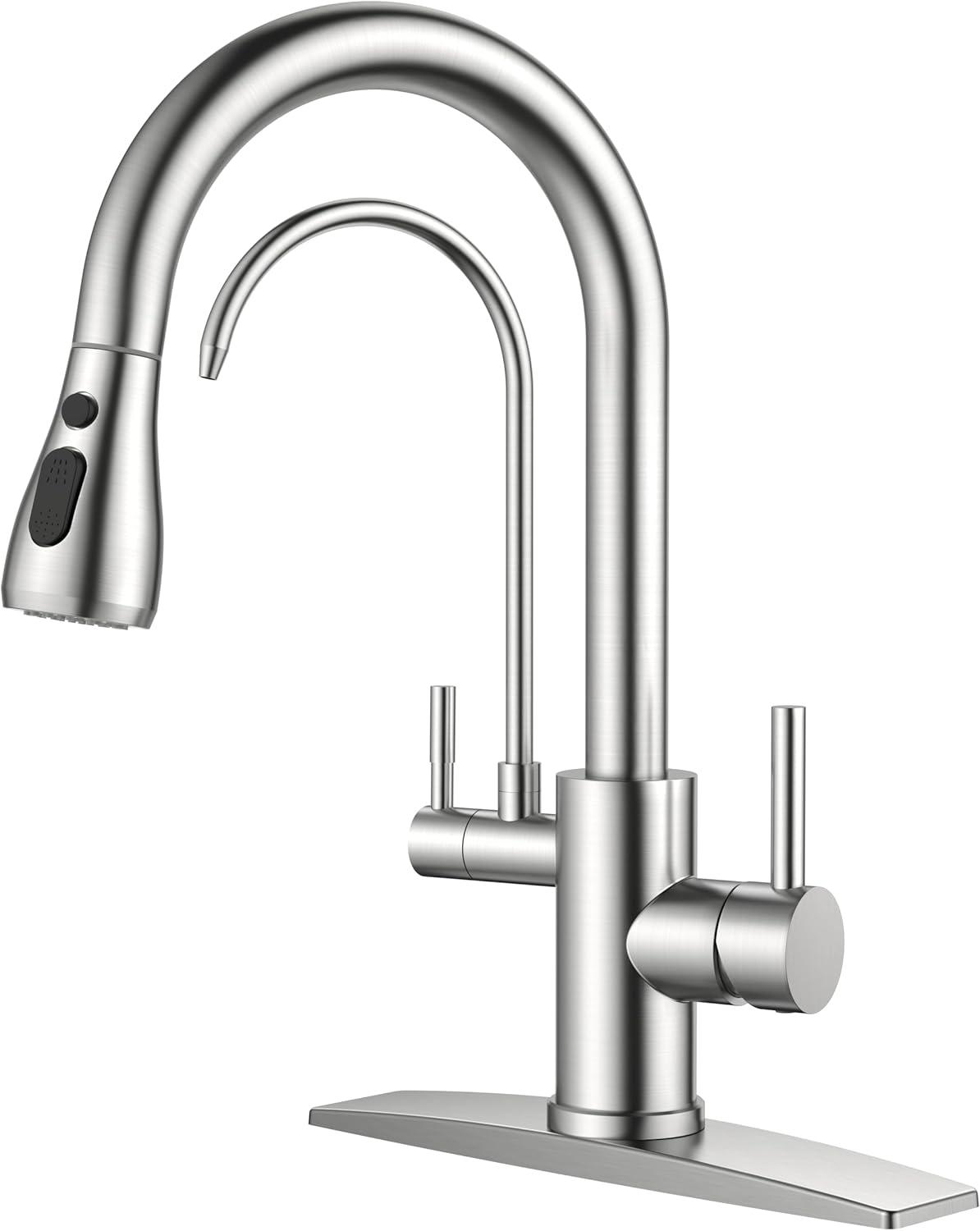 2 in 1 Sink Faucet Combo: This innovative faucet combines a pull down kitchen faucet and a built-in water filter faucet into one unit. Two spouts provide direct drinking water and hot/cold water. Get pure water easily without a separate faucet