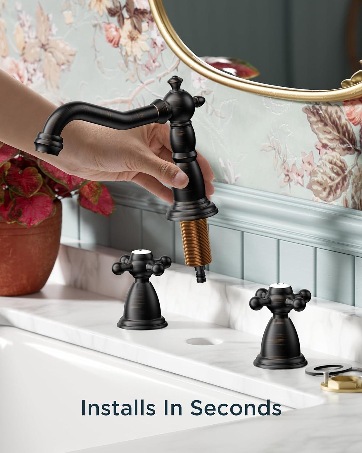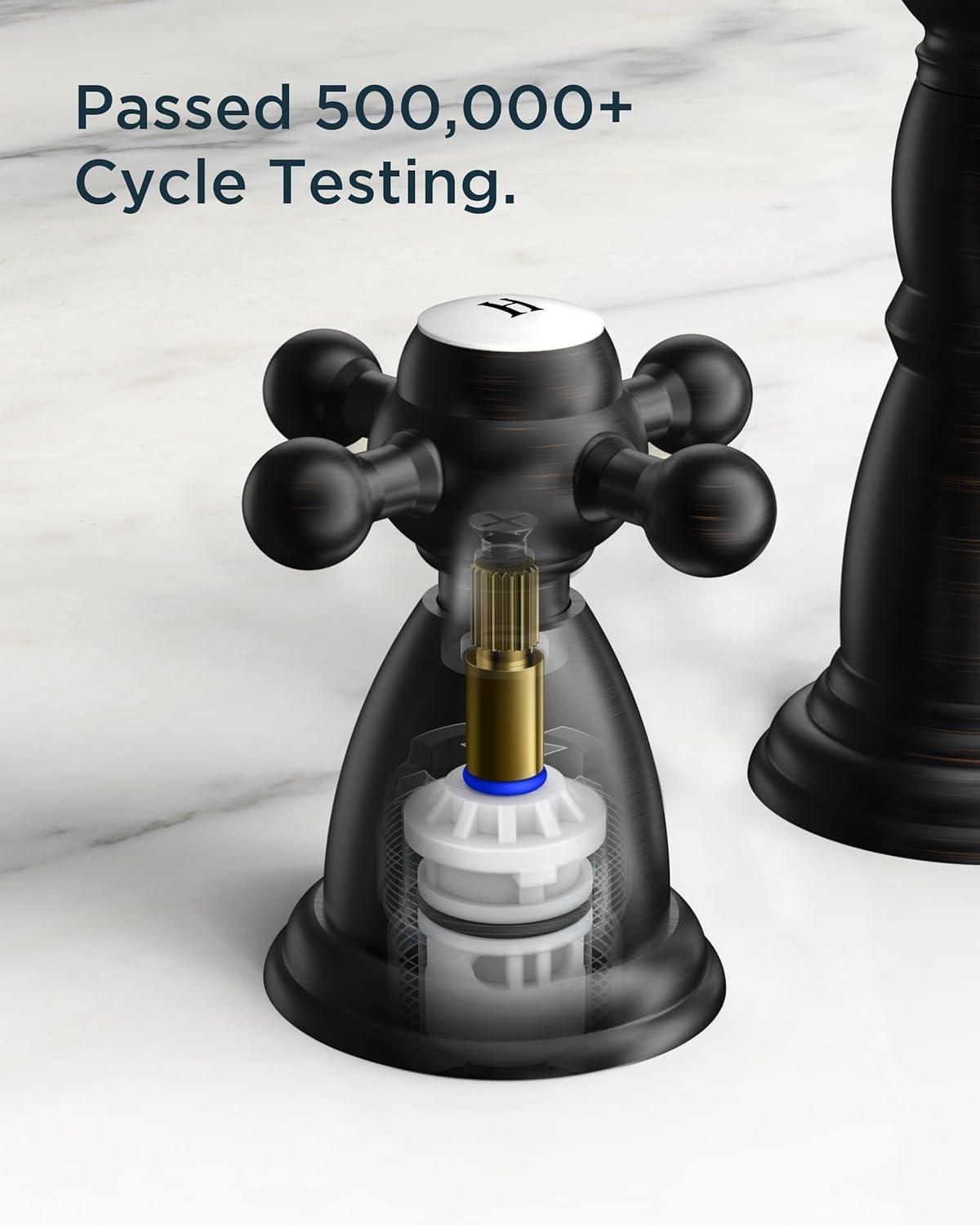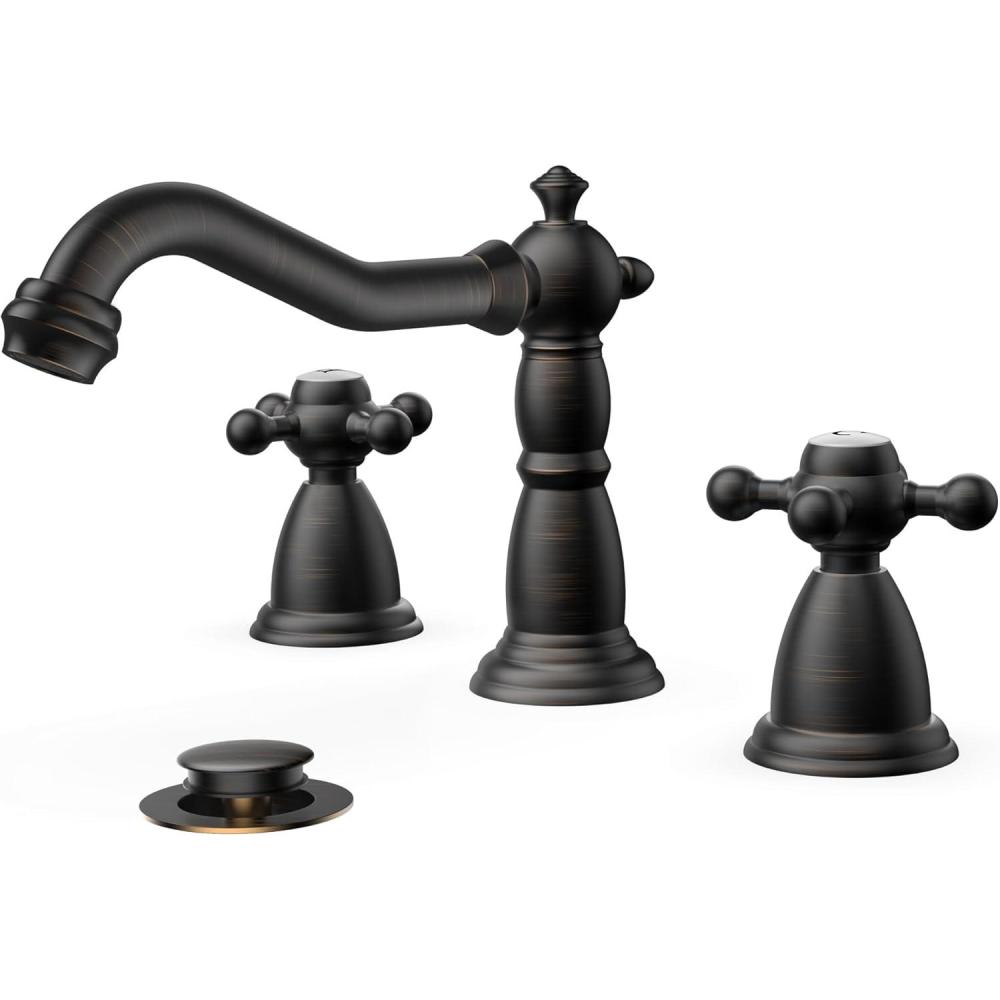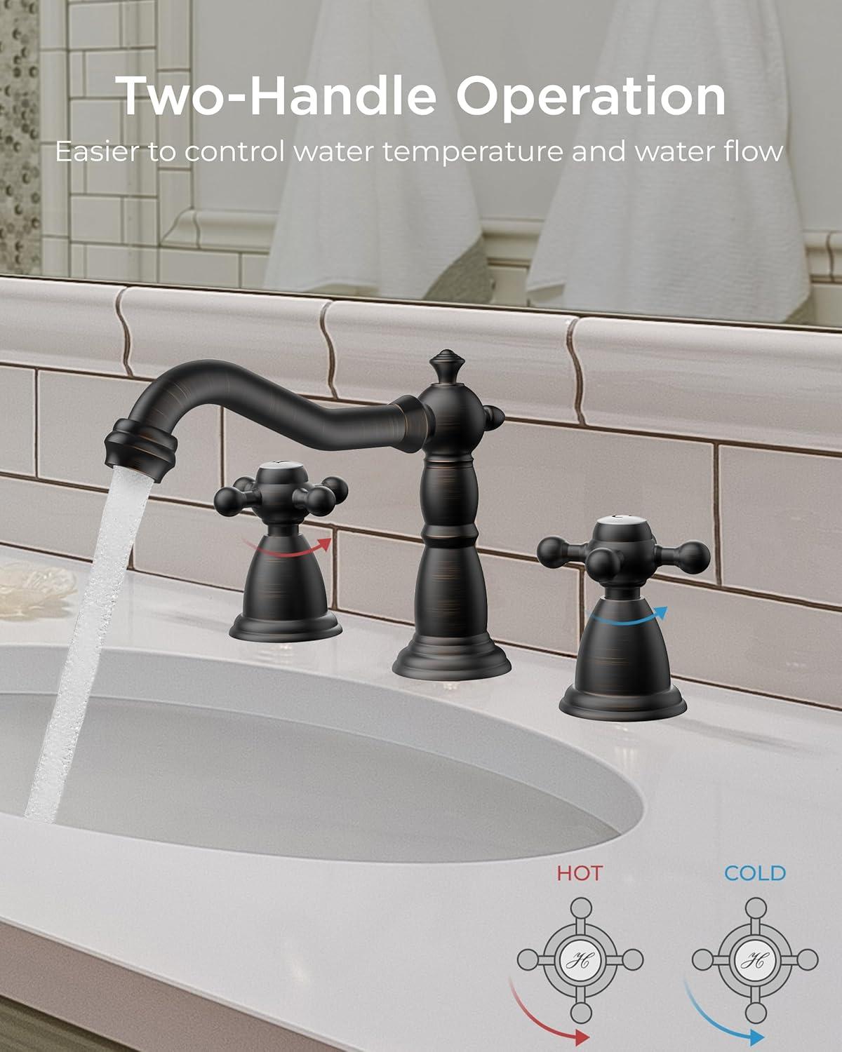 imageFORIOUS Matte Black 3 Hole Brass Vintage Farmhouse Bathroom Faucet 8 Inch Widespread Bathroom Faucets 2 Cross Handles with Metal Pop Up Drain and Supply Hoses for RV VanityOil Rubbed Bronze