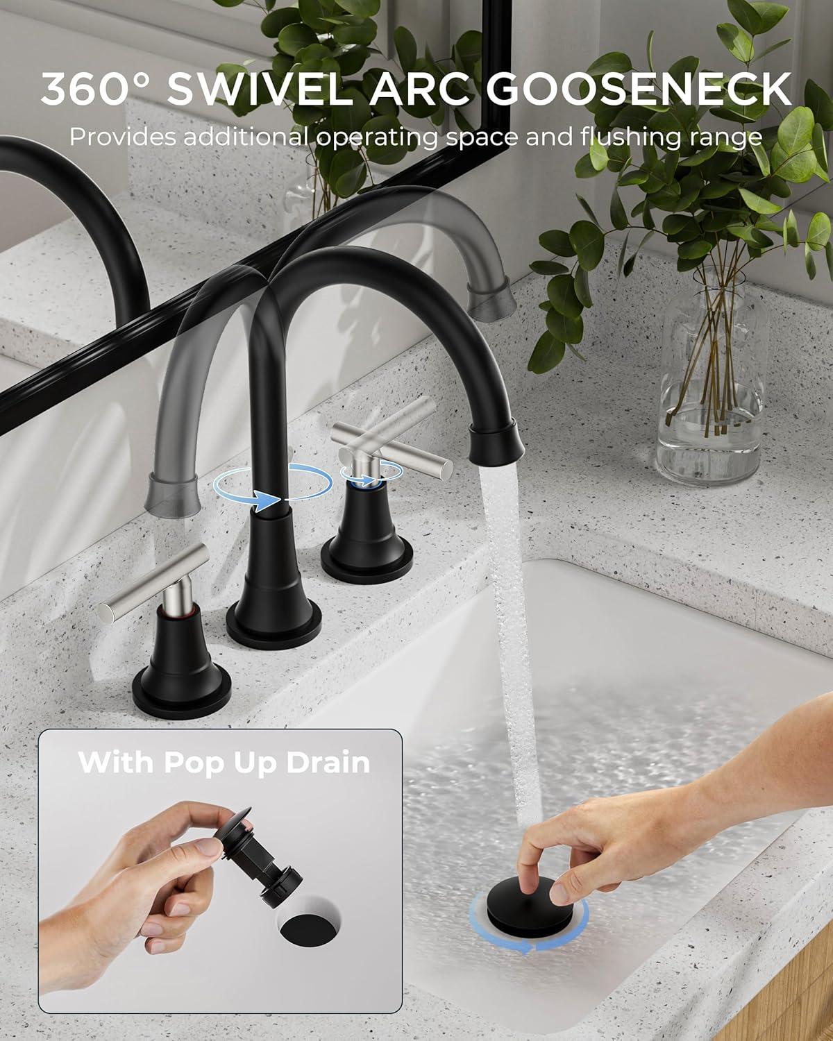 Leak-Free and Drip-Free: FORIOUS's Bathroom Faucets advanced drip-free ceramic valves tested for 500,000 times water tightness, the 2 handles allow effortless flow and water temperature control. 360-degree swivel high spout height bathroom faucets offers plenty of bathroom sink space and coverage for easy handwashing