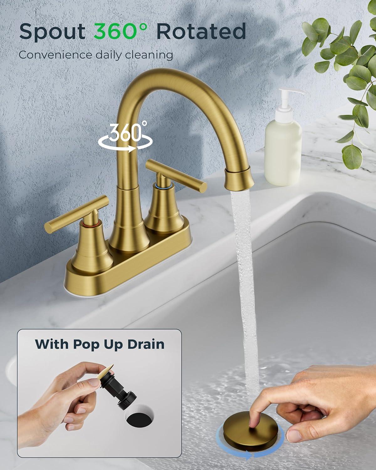 FORIOUS Matte Black Bathroom Sink Faucet, 4 Inch Centerset Bathroom Faucet 2 or 3 Hole with Pop up Drain and cUPC Hose, Two Handles Control, 360° spout for Restroom,Vanity, Rv(Brushed Gold)