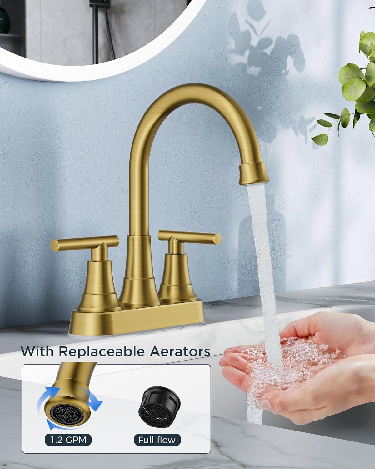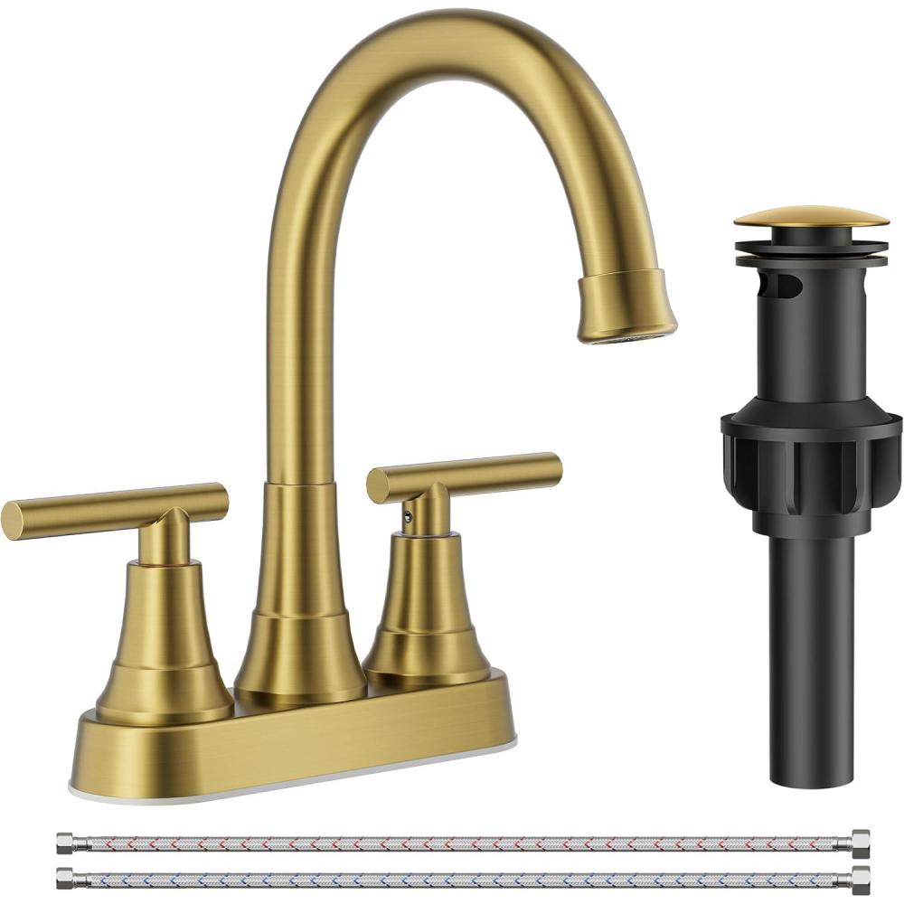 imageFORIOUS Matte Black Bathroom Sink Faucet 4 Inch Centerset Bathroom Faucet 2 or 3 Hole with Pop up Drain and cUPC Hose Two Handles Control 360 spout for RestroomVanity RvBrushed Gold