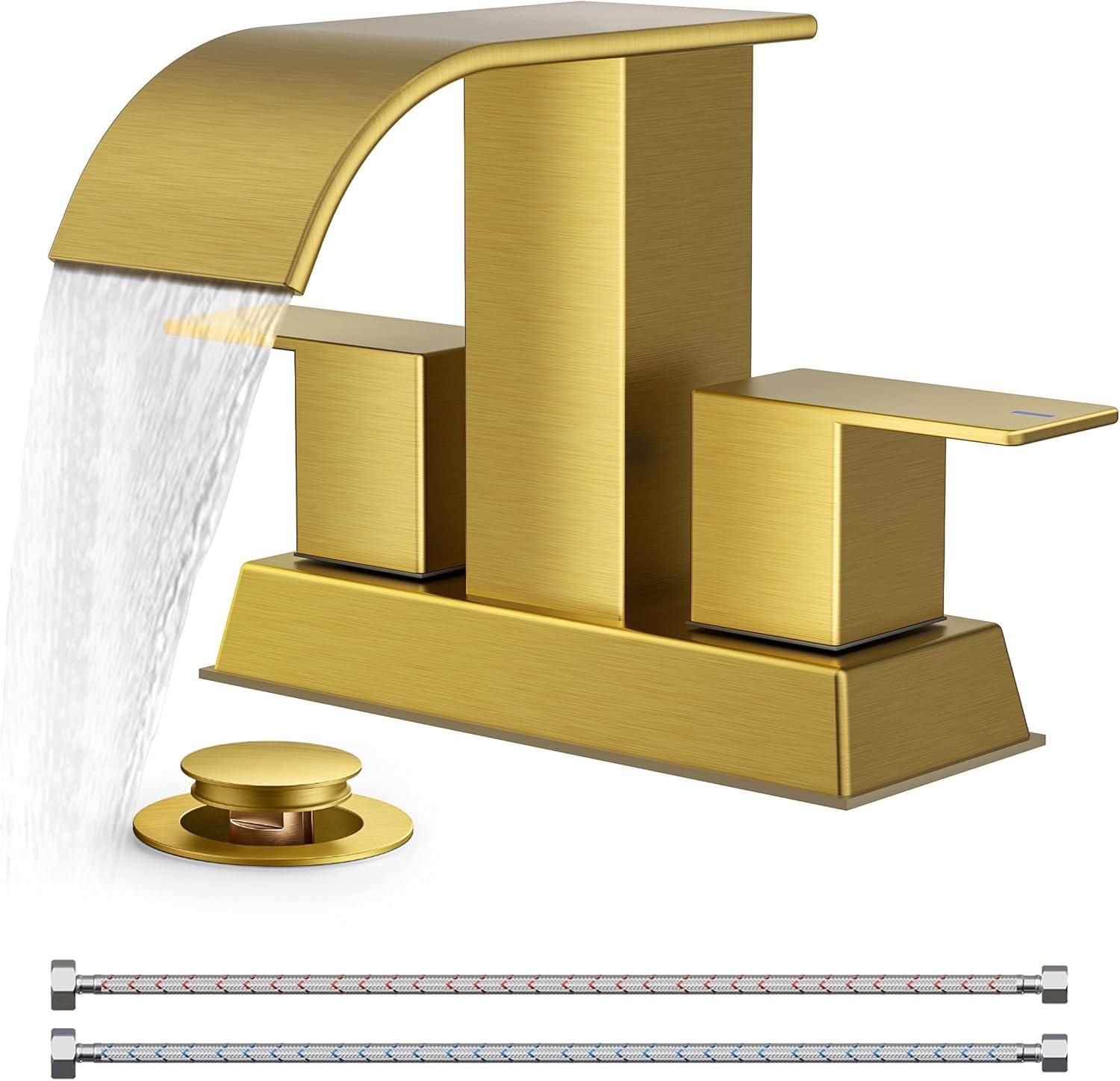FORIOUS Matte Black Bathroom Sink Faucet, Waterfall 4 Inch Centerset Bathroom Faucets with Metal Pop up Drain and cUPC Hose for Basin,Vanity, Rv, Lavatory 2 or 3 Hole Sink(Brushed Gold)