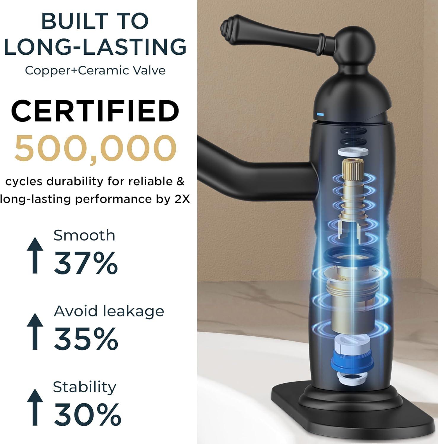 【WaterSense Certified Performance】Our antique brass vanity faucet exceeds EPA standards with 1.2gpm/4.5L/min at Max 60psi flow rate water saving aerator . The single handle bathroom faucet's ceramic disc cartridge withstands 500,000 cycles (15+ years) with leak-proof performance. Dual-layer plated design adheres to NSF/ANSI 61 water quality standards