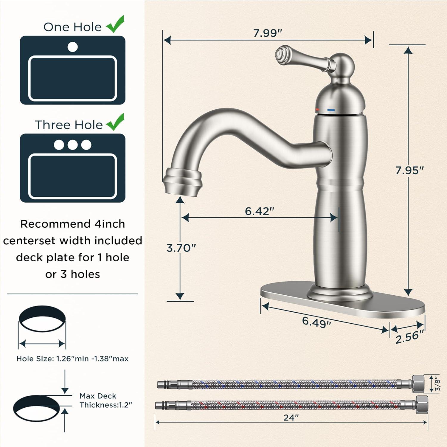 【1-Hole Universal Installation】Engineered as a versatile 1 hole bathroom faucet, our antique brass bathroom faucet adapts to standard 1 hole configurations. Includes pre-assembled 3/8″ Teflon-coated supply lines and hardwares for 15-minute DIY installation.Specifically designed for farnhouse bathroom sink applications,also used for 3 hole vanity and laundry sink remodel