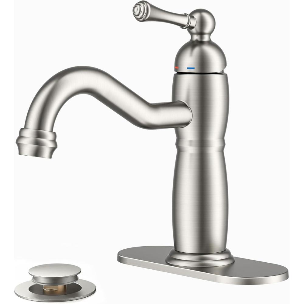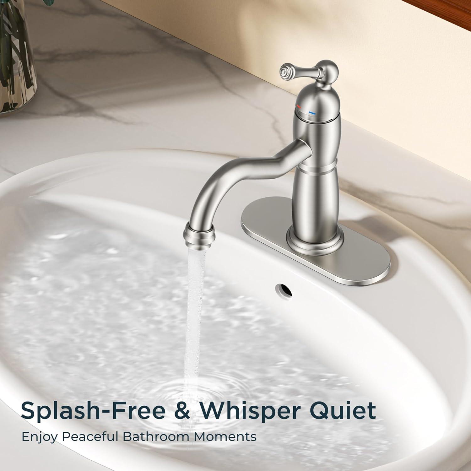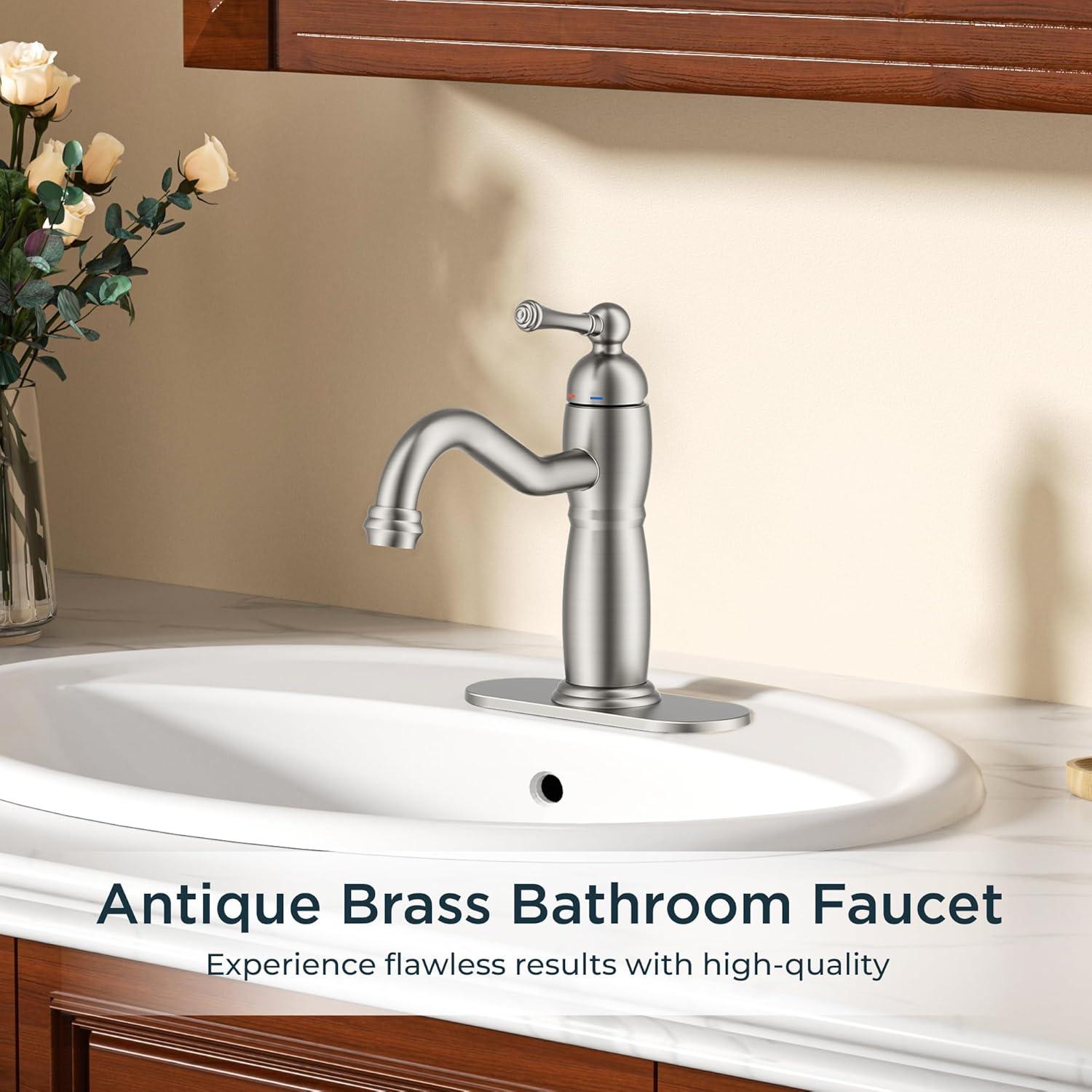 【Single Handle Precision Design】This single handle bathroom sink faucet combines vintage aesthetics with modern functionality. The ergonomic lever enables precise temperature and water flow control. The transitional design bridges farmhouse charm with contemporary bathroom styles through its antique brass vanity faucet detailing.