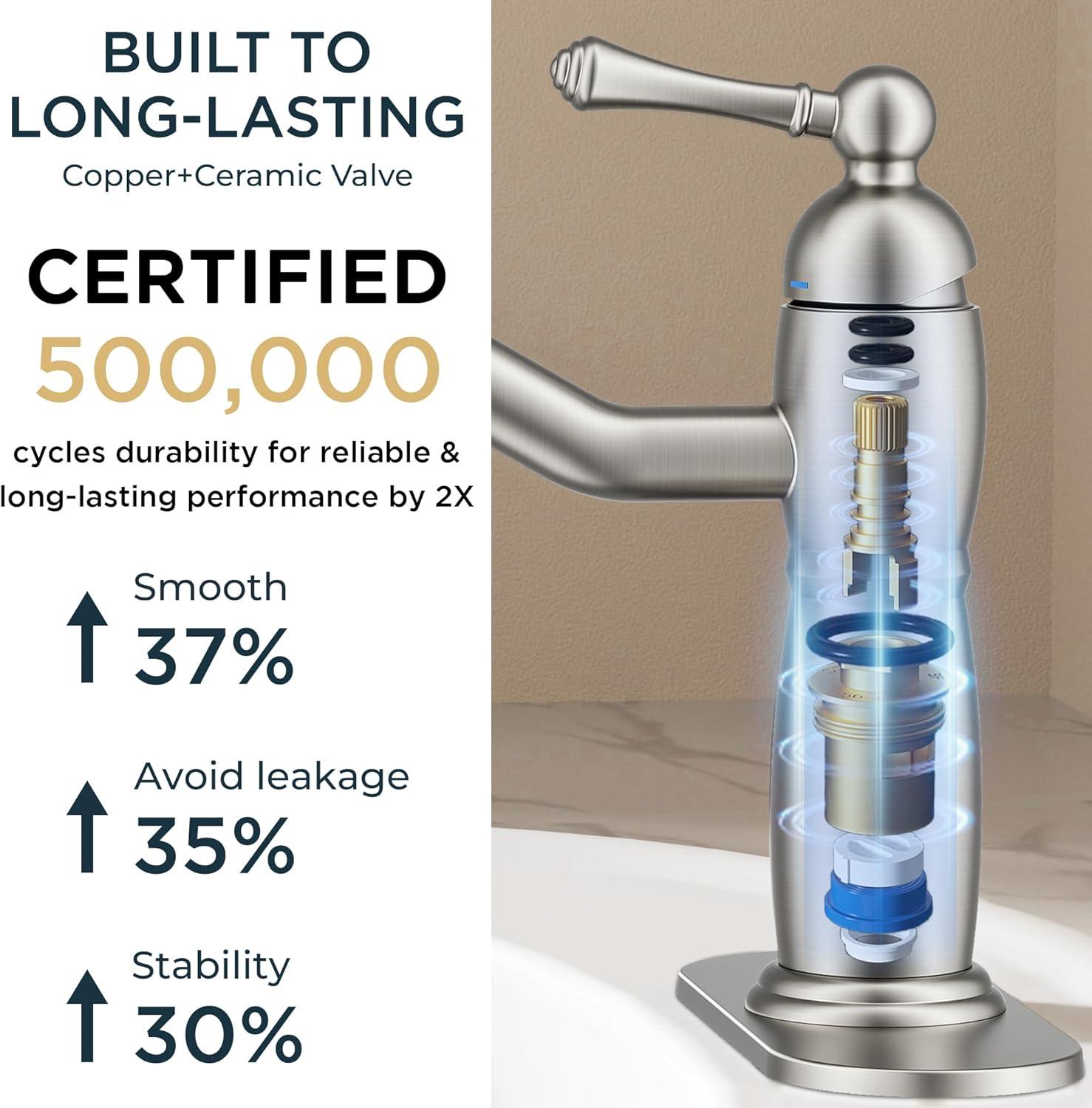 【WaterSense Certified Performance】Our antique brass vanity faucet exceeds EPA standards with 1.2gpm/4.5L/min at Max 60psi flow rate water saving aerator . The single handle bathroom faucet's ceramic disc cartridge withstands 500,000 cycles (15+ years) with leak-proof performance. Dual-layer plated design adheres to NSF/ANSI 61 water quality standards