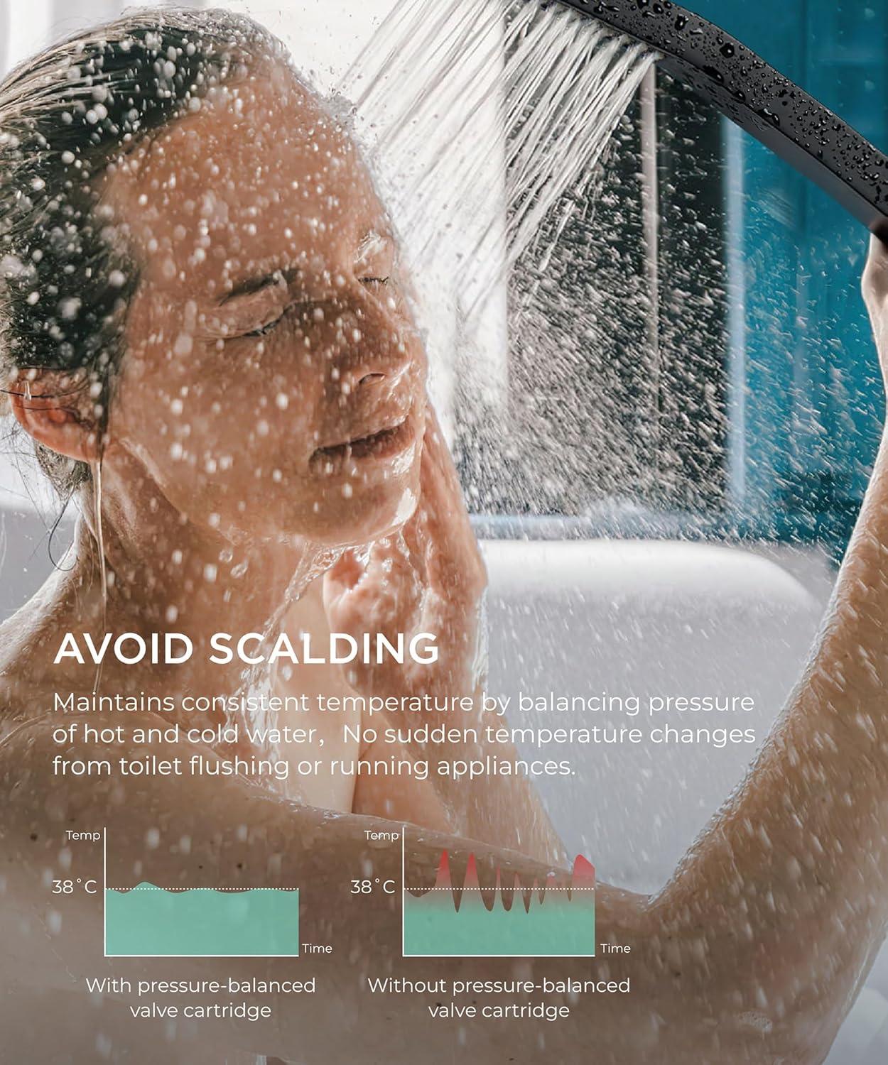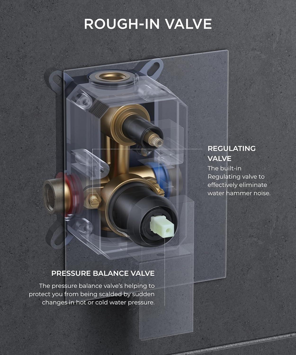 Preventing Water Hammer: The pressure balance valve has two built-in check valves to effectively eliminate water hammer. Monitors the water pressure balance without sudden temperature changes from toilet flushing or running appliances