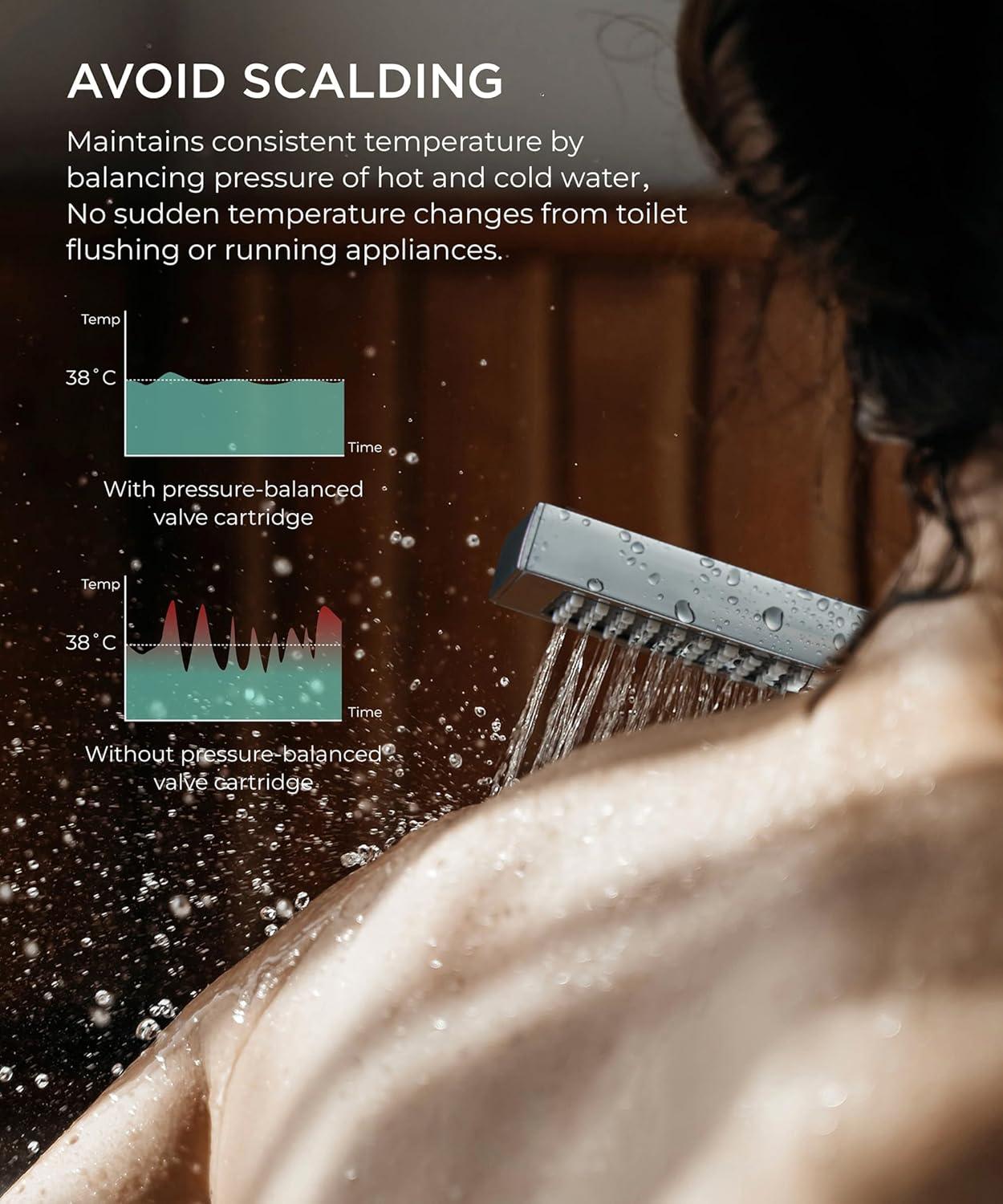 Preventing Water Hammer: The pressure balance valve has two built-in check valves to effectively eliminate water hammer. Monitors the water pressure balance without sudden temperature changes from toilet flushing or running appliances