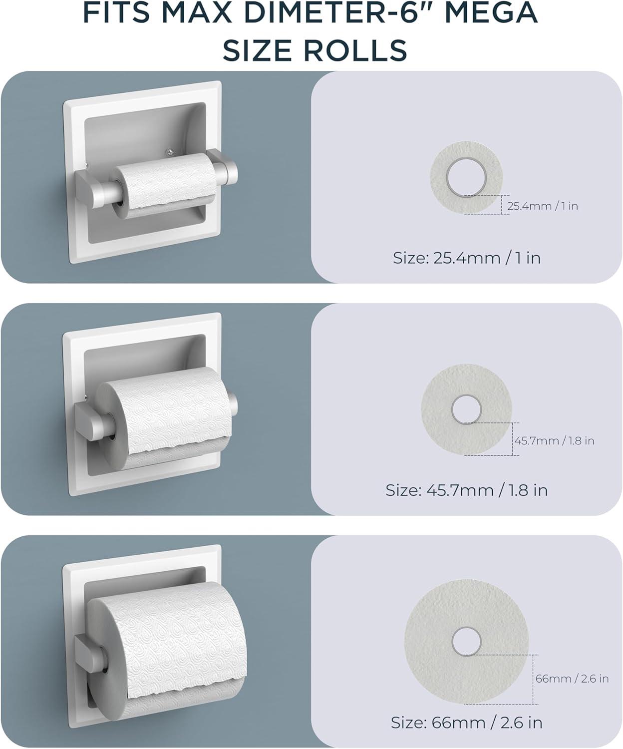 MEGA ROLL HOLDER: Deep tested to accommodate mega-large paper rolls well with a diameter of up to 6 inches. FORIOUS recessed toilet paper holder provides continuous parts replacement and dedicated technical support, there is nothing more convincing than reliability